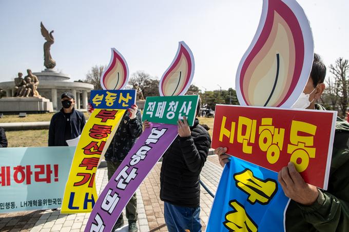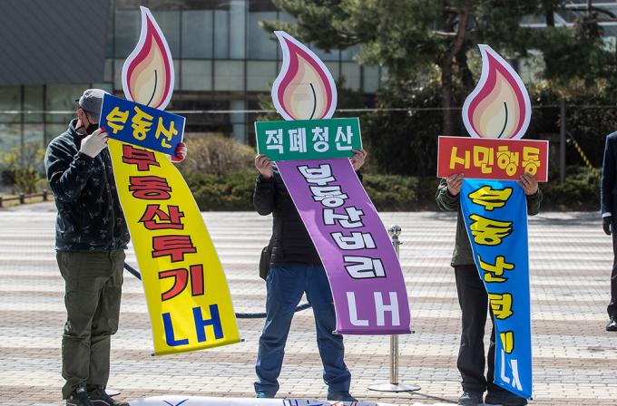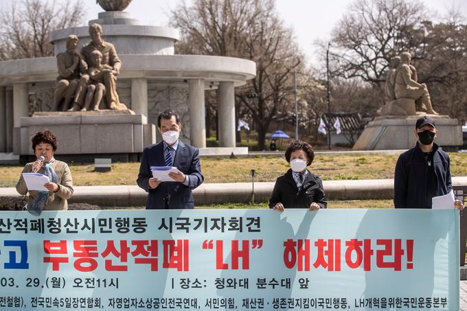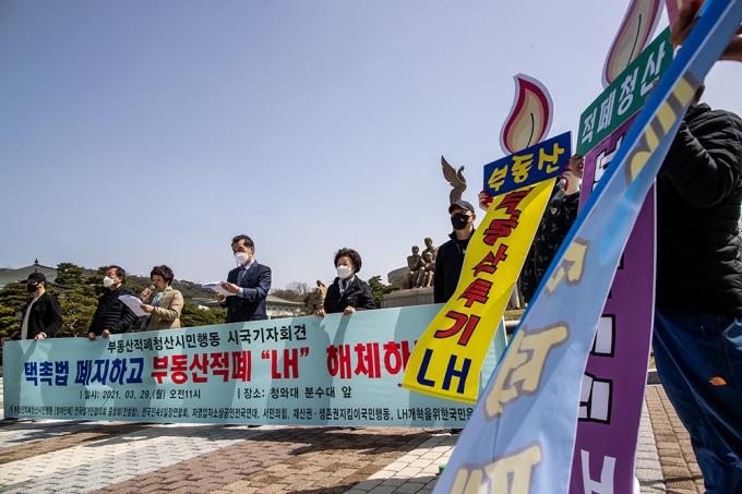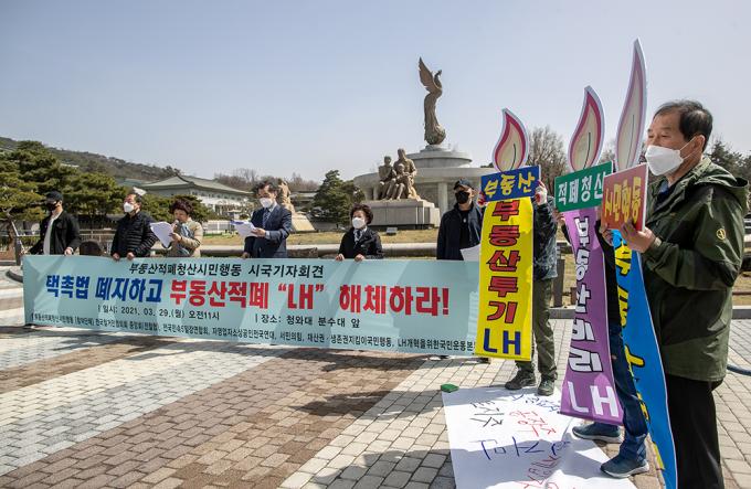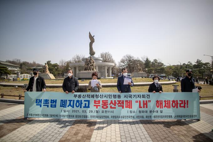 부동산적폐청산시민행동 관계자들이 29일 오전 서울 종로구 청와대 사랑채 앞 분수대에서 '택촉법 폐지, 부동산 적폐 LH해체' 기자회견을 하고 있다.