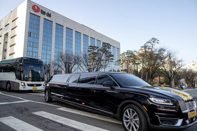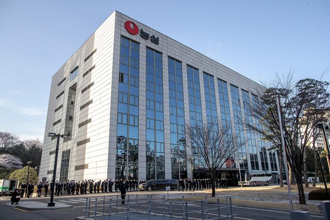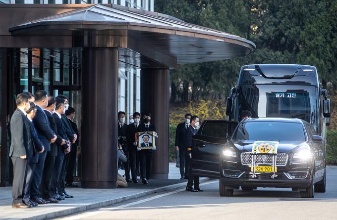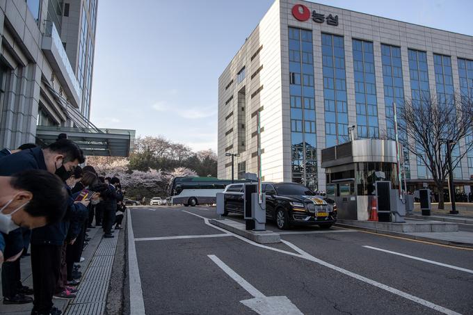 고 신춘호 농심 회장 영결식이 엄수된 30일 오전 서울 동작구 농심 본사에서 임직원들이 도열한 가운데 운구차량이 장지로 향하고 있다.
