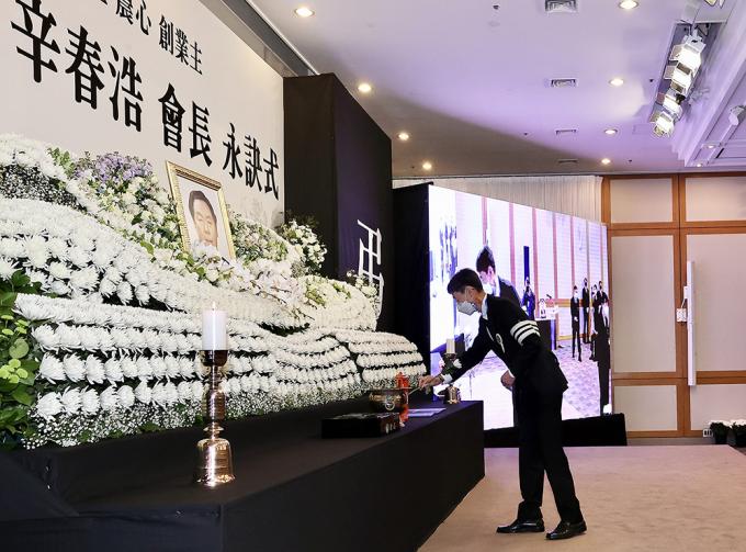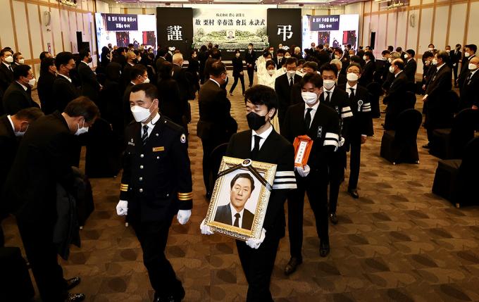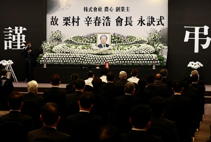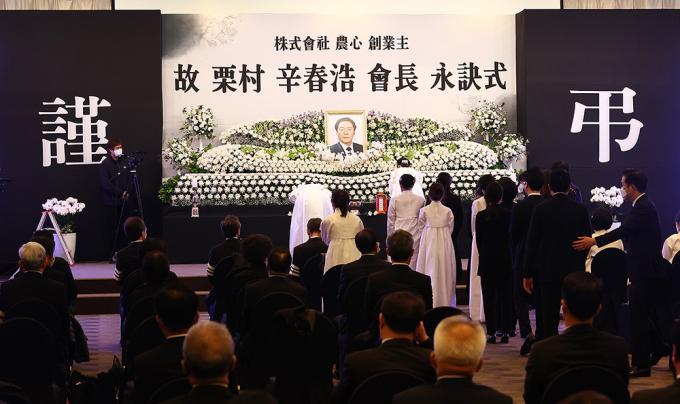 30일 오전 서울 동작구 농심 본사에서 열린 농심 창업주 신춘호 회장의 영결식에서 유가족들이 헌화하고 있다.