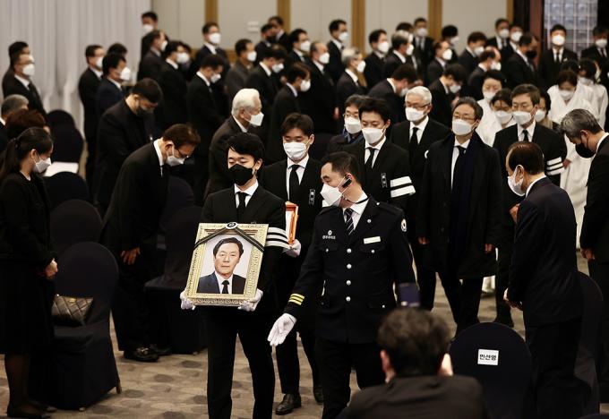 30일 오전 서울 동작구 농심 본사에서 창업주 고 신춘호 회장의 영결식이 끝난 후 유족들이 고인의 영정사진을 들고 영결식장을 나서고 있다.