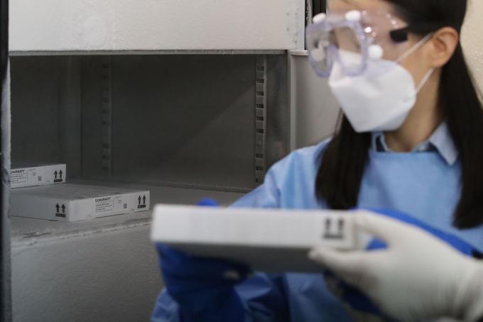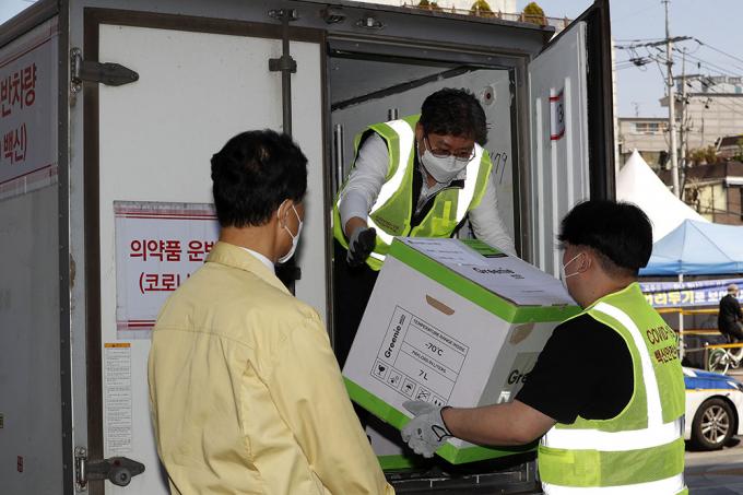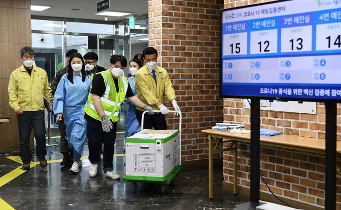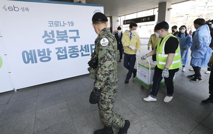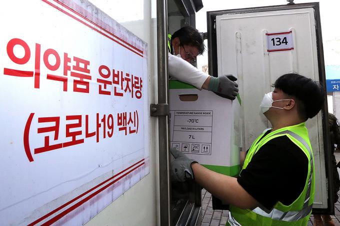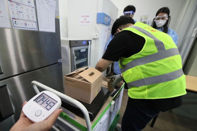 30일 오후 서울 성북구청에 마련된 예방접종센터에 화이자의 코로나19 백신이 도착해 관계자들이 백신 상자를 옮기고 있다. 화이자 백신은 4월1일부터만 75세 이상 고령층에 접종된다.
