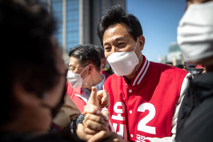 오세훈 국민의힘 서울시장 후보가 30일 오후 서울 영등포구 영등포역에서 열린 집중 유세에서 시민들과 인사하고 있다.