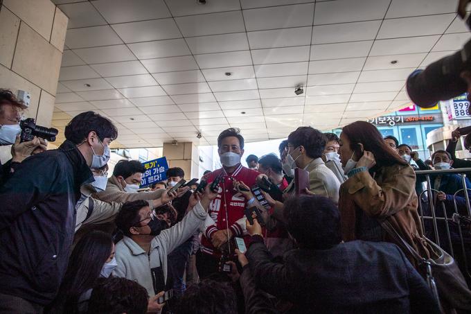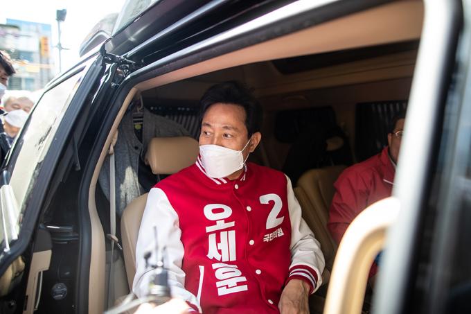 오세훈 국민의힘 서울시장 후보가 30일 오후 서울 영등포구 영등포역에서 열린 집중 유세를 마친 뒤 취재진의 질문에 답하고 있다.