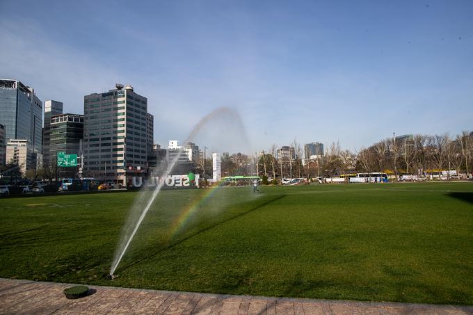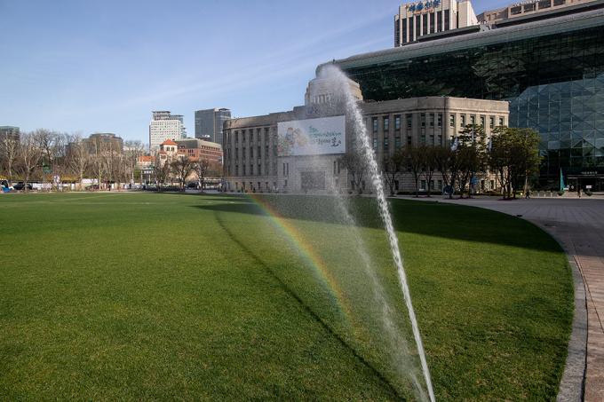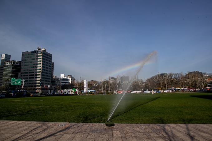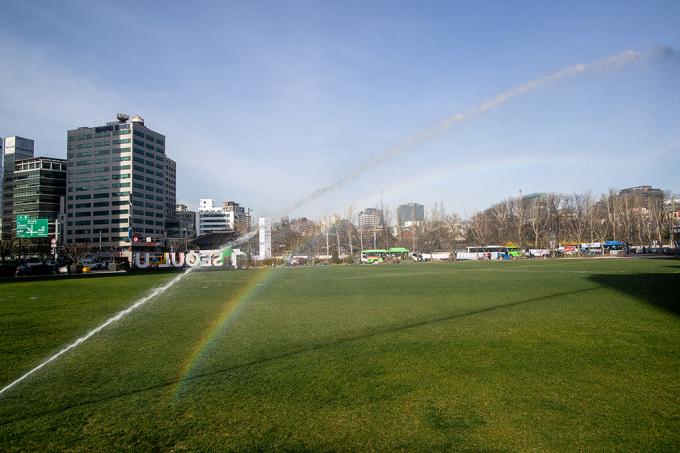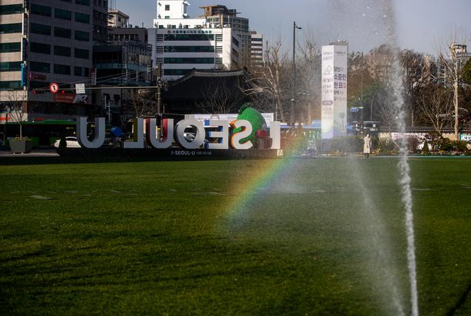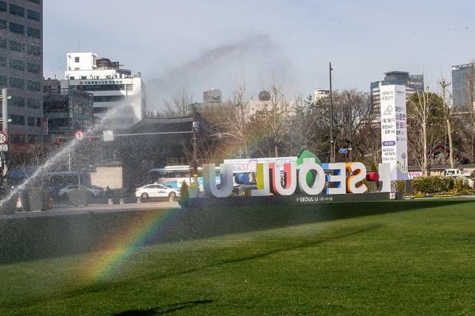 31일 오전 물보라 흩날리는 서울광장 잔디밭 위로 무지개가 떴다.
