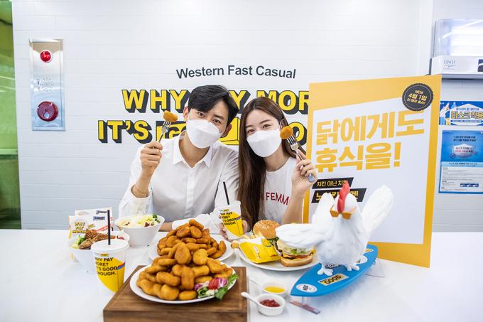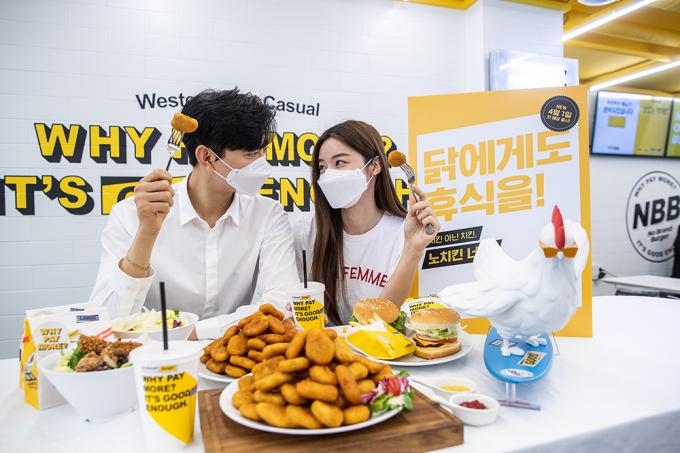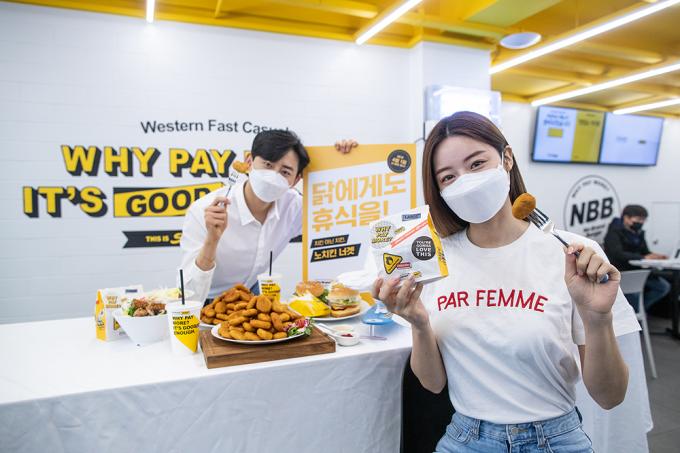 31일 오전 서울 중구 노브랜드버거 서울시청점에서 모델들이 대체육으로 만든 '노치킨 너겟'을 선보이고 있다. 노치킨 너겟은 영국 대체육 브랜드 퀸의 마이코프로틴을 활용해 만든 너겟이다. 마이코프로틴은 미생물에서 추출한 단백질로 조직구성이 가느다란 실 형태로 되어있어 식감이 닭가슴살과 비슷하다.
