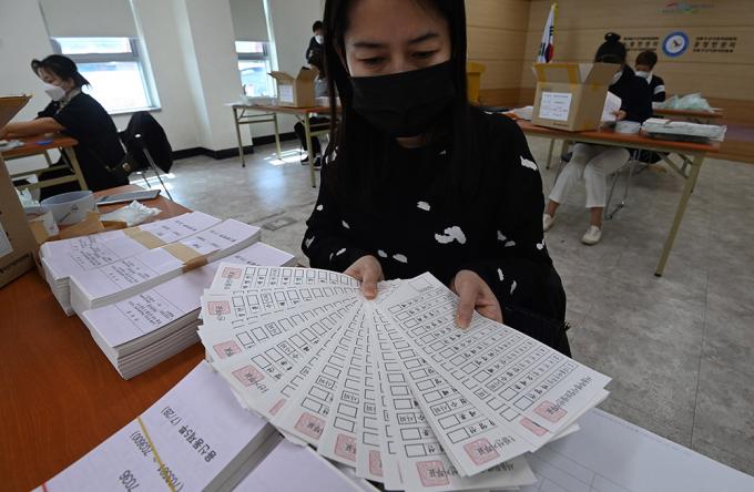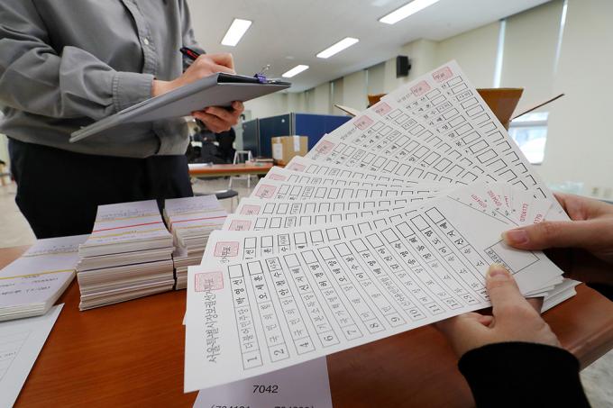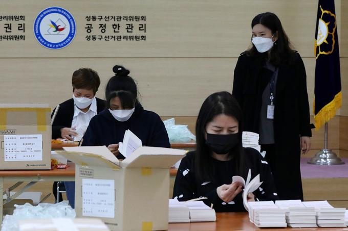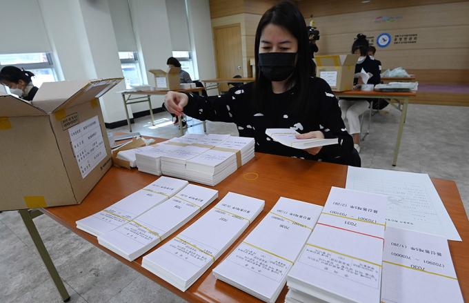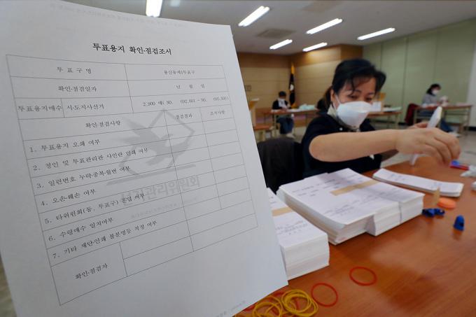 4.7 서울시장 보궐선거를 일주일 앞둔 31일 서울 동대문구 선거관리위원회에서 동대문구 선거관리위원회 관계자들이 투표용지를 검수하고 있다.