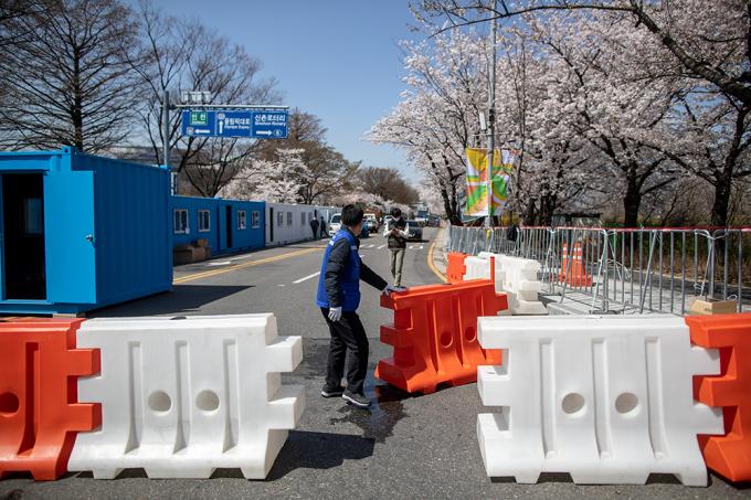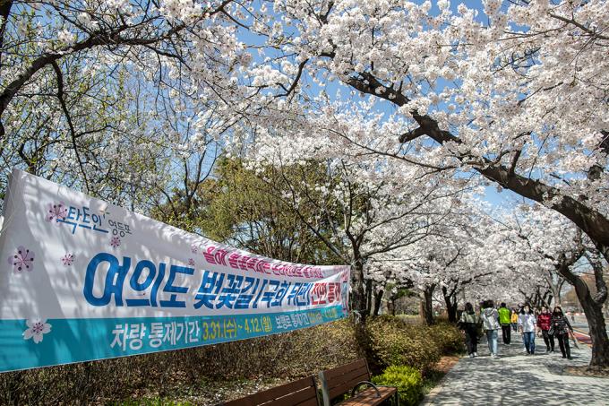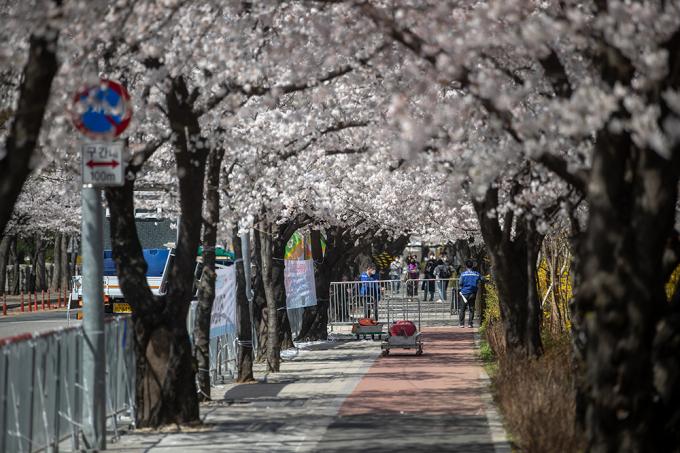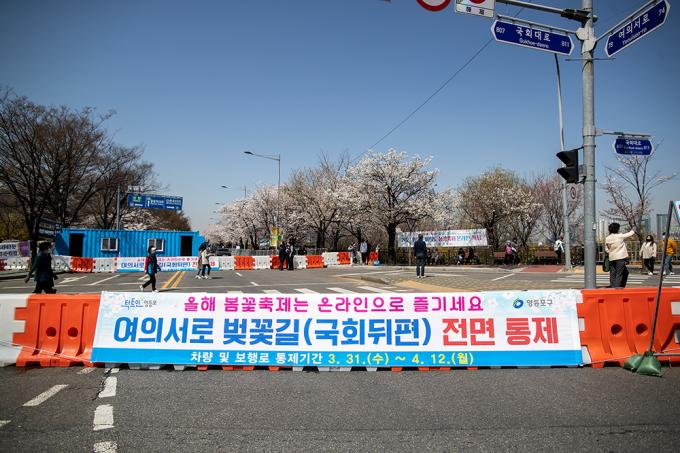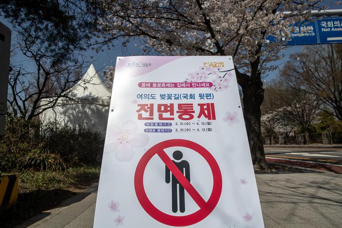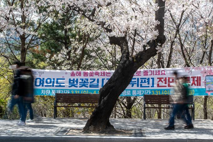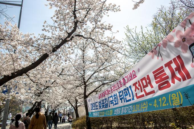 활짝 핀 벚꽃은 눈부신데 가까이 다가갈 수 없다. 코로나19 바이러스는 꽃구경마저 허락질 않는다. 31일 서울 여의도 국회의사당 뒤편 여의서로 벚꽃길에 통제 안내 현수막이 걸려 있다. 서울시 영등포구는 이날 오전 9시부터 4월 12일까지 벚꽃길 도로와 보행로를 통제한다.