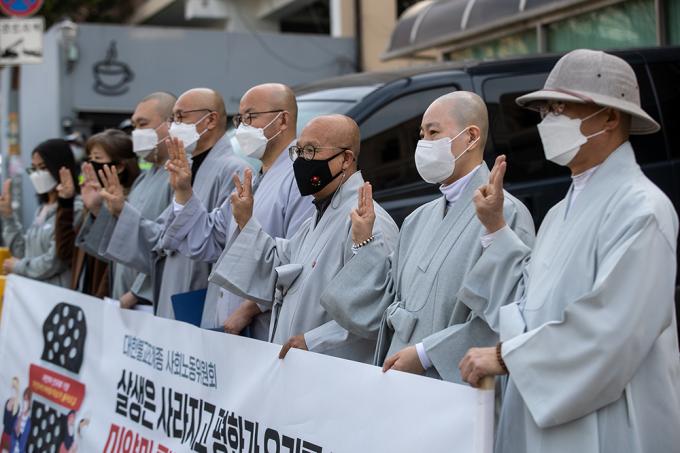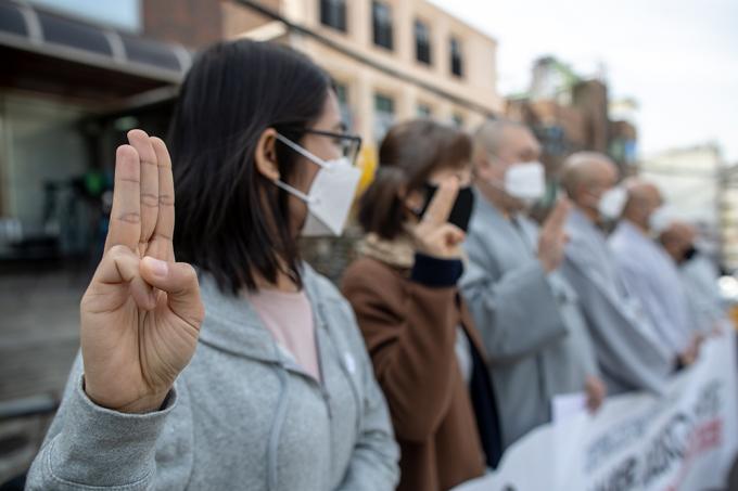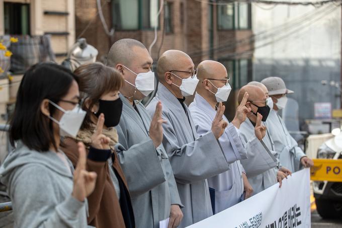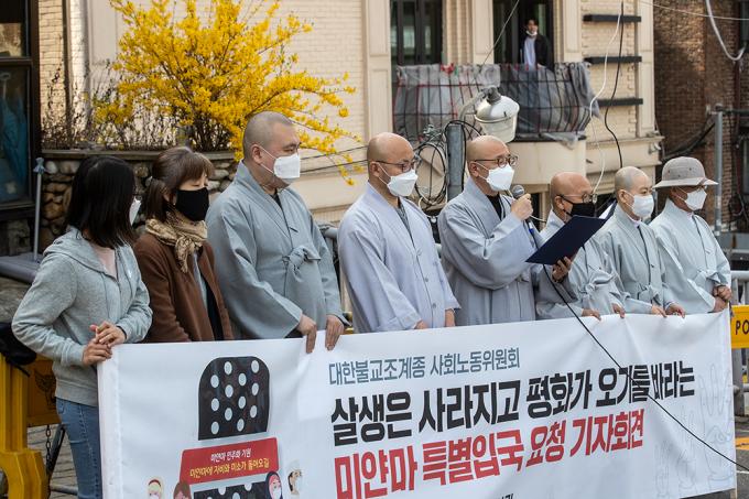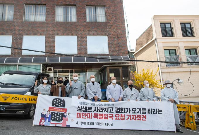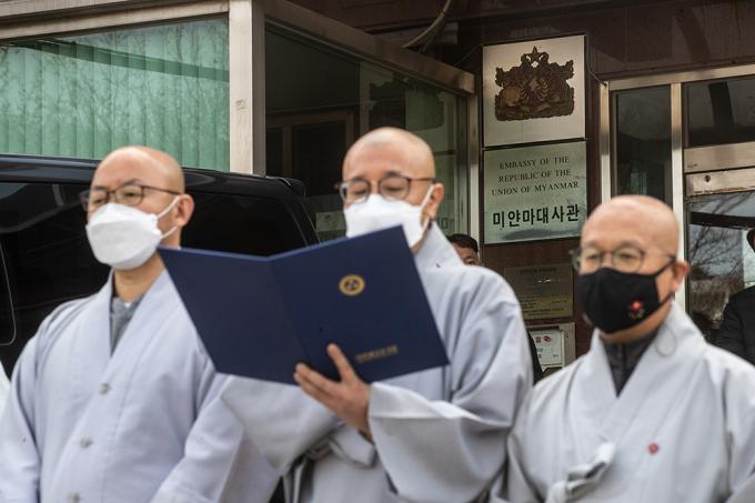 대한불교조계종 사회노동위원회 스님들이 1일 오전 서울 용산구 주한미얀마대사관 앞에서 기자회견을 열고 미얀마 평화기도를 위한 특별입국 요청을 하고 있다. 스님들은 참상이 벌어지는 미얀마에 살생과 폭력이 멈추기를 바라는 기도를 드리자는 취지로 특별 입국을 요청한다고 밝혔다.