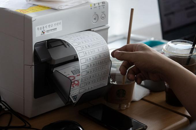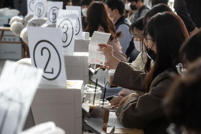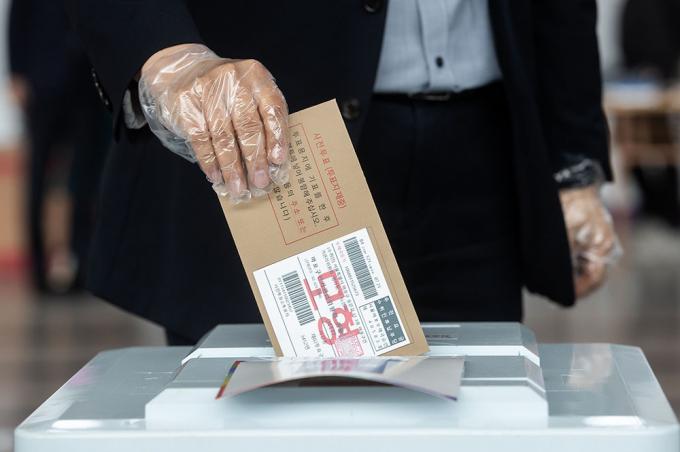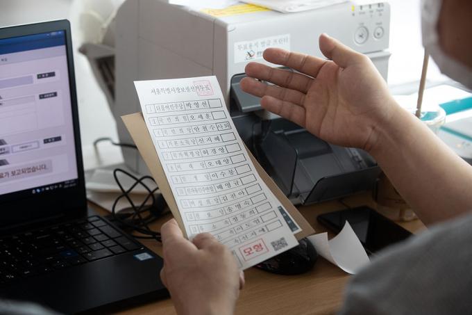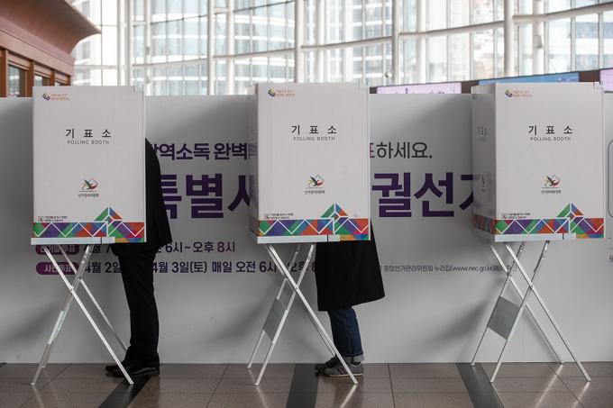4.7 서울시장 보궐선거 사전투표를 하루 앞둔 1일 서울역에 설치된 남영동 사전투표소에서 서울시 선거관리위원회 관계자들이 사전투표 모의시험을 하고 있다.