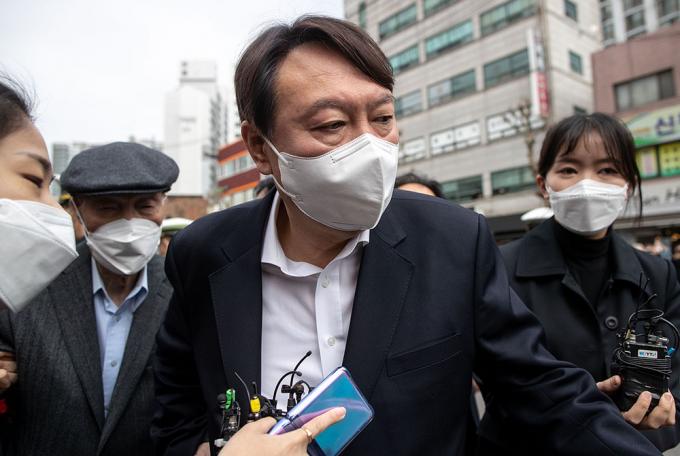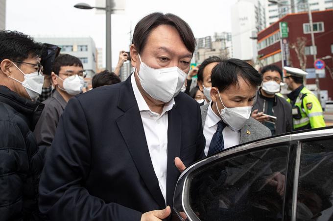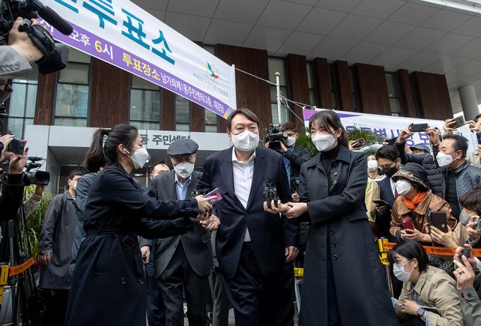 윤석열 전 검찰총장이 아버지 윤기중 연세대 명예교수와 함께 2일 오전 서울 서대문구 남가좌1동 주민센터에 마련된 사전투표소로 들어가고 있다.