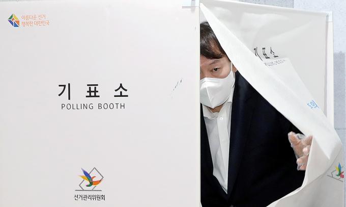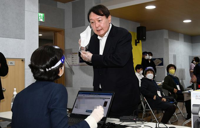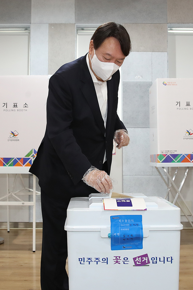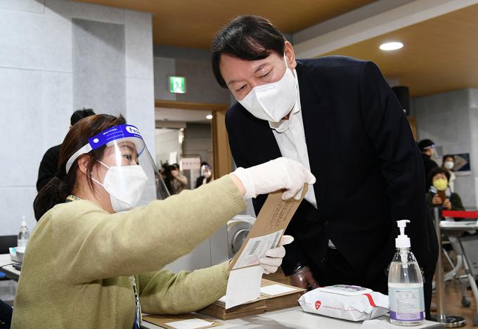 윤석열 전 검찰총장이 4·7 재·보궐선거 사전투표 첫날인 2일 오전 서울 서대문구 남가좌1동 주민센터에 마련된 사전투표소에서 투표를 하고 있다.