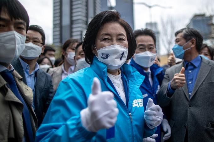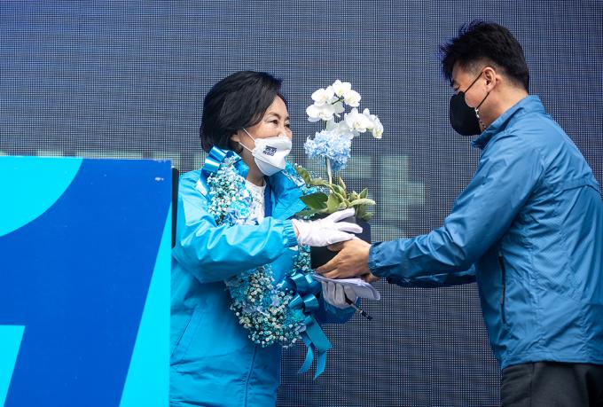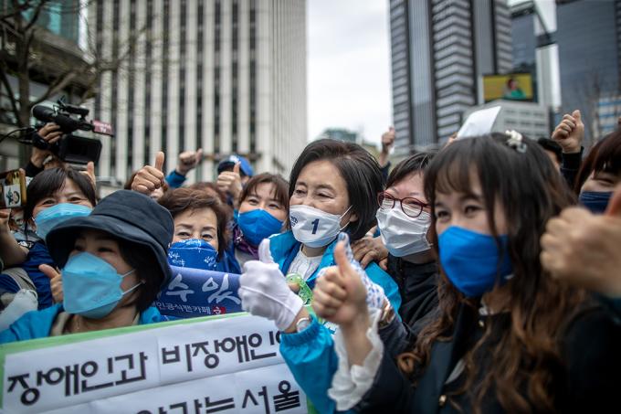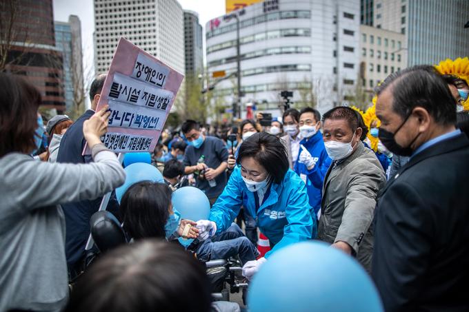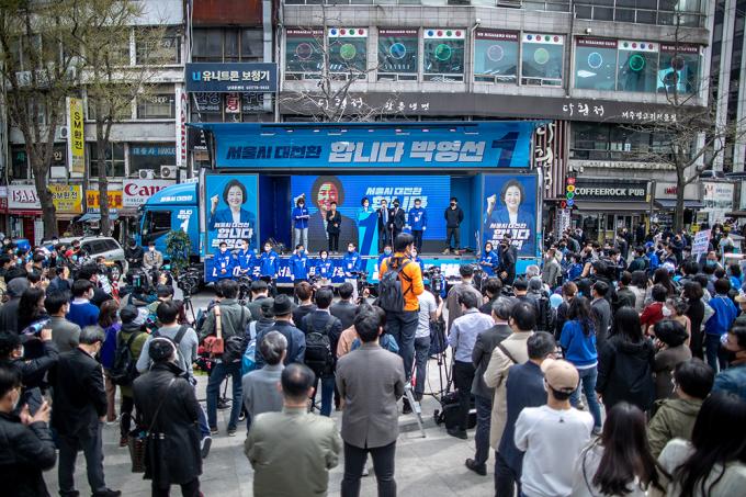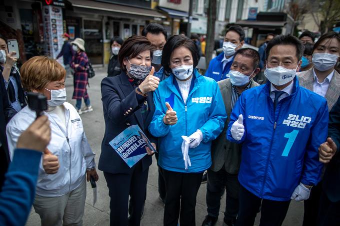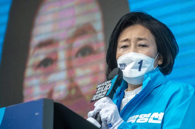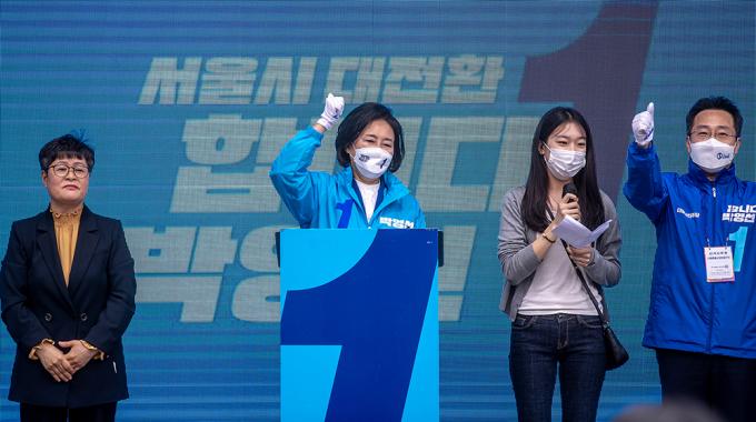 더불어민주당 박영선 서울시장 후보가 2일 서울 중구 남대문시장 앞에서 열린 집중유세에서 유권자들에게 지지를 호소하고 있다.