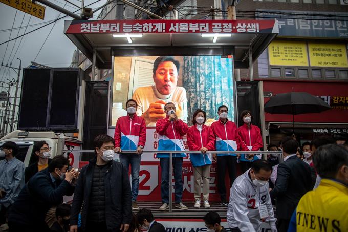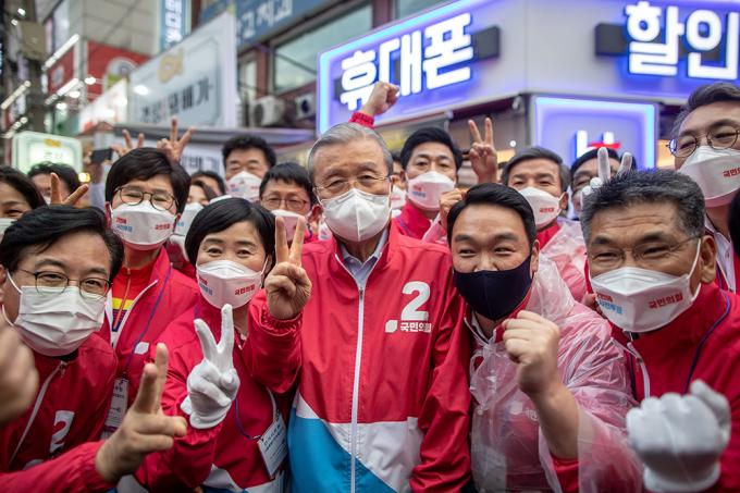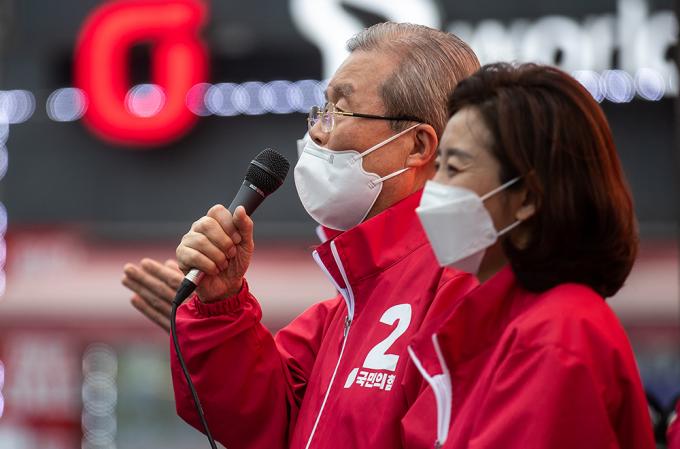 김종인 국민의힘 비상대책위원장이 2일 오후 서울 양천구 목동깨비시장에서 열린 오세훈 후보의 집중유세에서 유권자들에게 지지를 호소하고 있다.