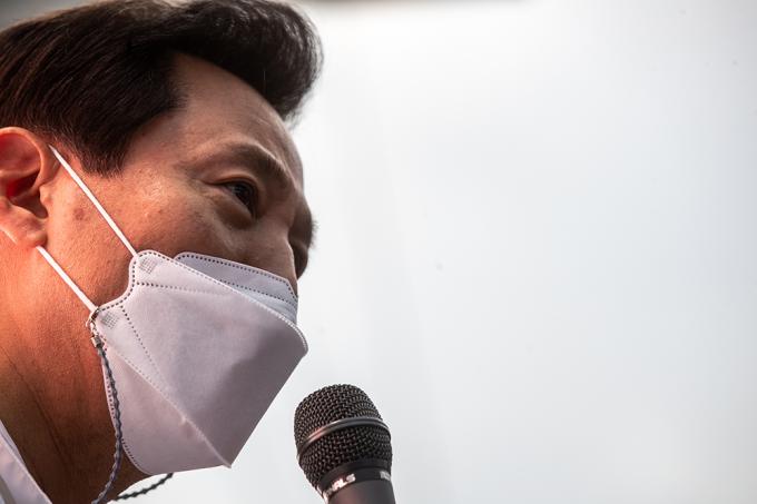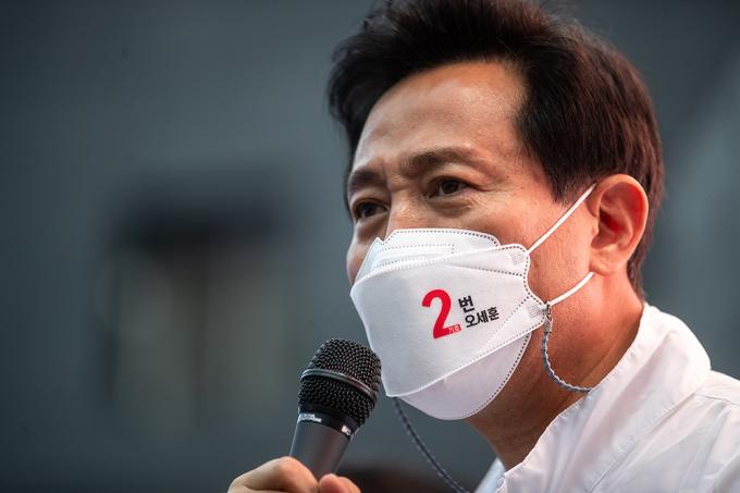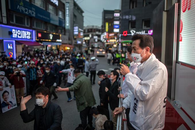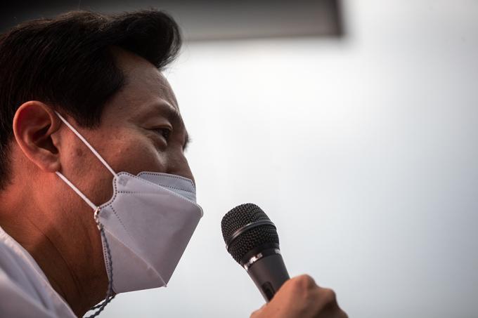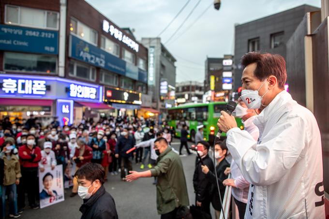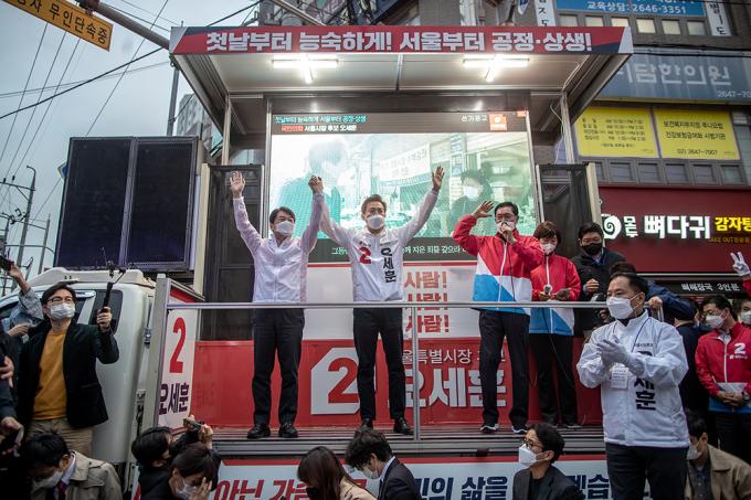 국민의힘 오세훈 서울시장 후보와 안철수 국민의당 대표가 2일 오후 서울 양천구 목동깨비시장에서 열린 집중유세에서 유권자들의 지지를 호소하고 있다.
