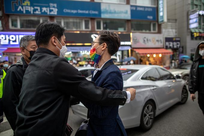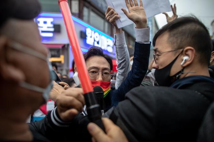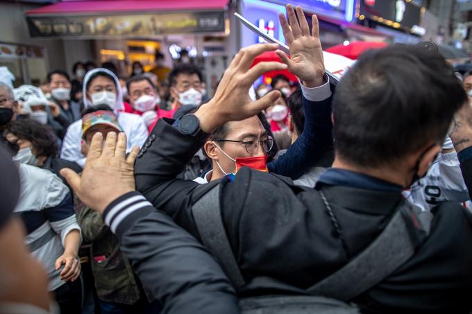 미래당 오태양 서울시장 후보가 2일 오후 서울 양천구 목동깨비시장에서 국민의힘 오세훈 서울시장 후보 같은 자리에서 선거유세를 하던 도중 가로막혀 있다.