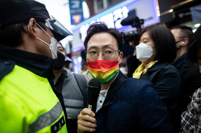 미래당 오태양 서울시장 후보가 2일 오후 서울 양천구 목동깨비시장에서 국민의힘 오세훈 서울시장 후보와 같은 자리 선거운동을 하던 도중 경찰에 가로막혀 있다.