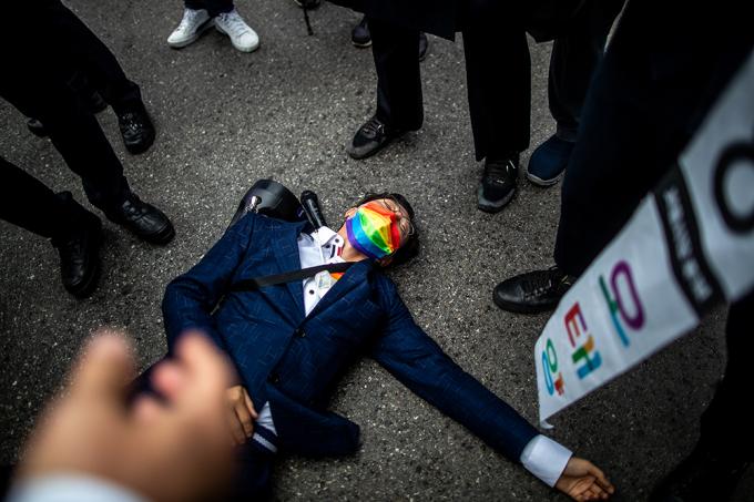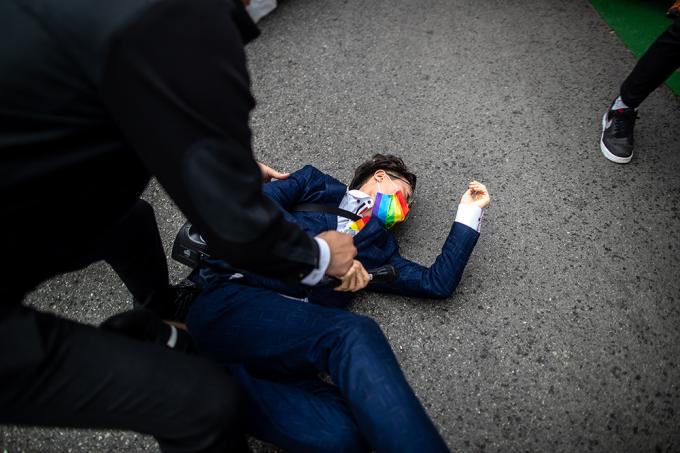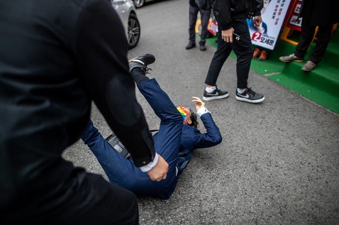 미래당 오태양 서울시장 후보가 2일 오후 서울 양천구 목동깨비시장에서 국민의힘 오세훈 서울시장 후보와 같은 자리에서 선거운동을 하던 도중 경찰에 제지당해 쓰러져있다.