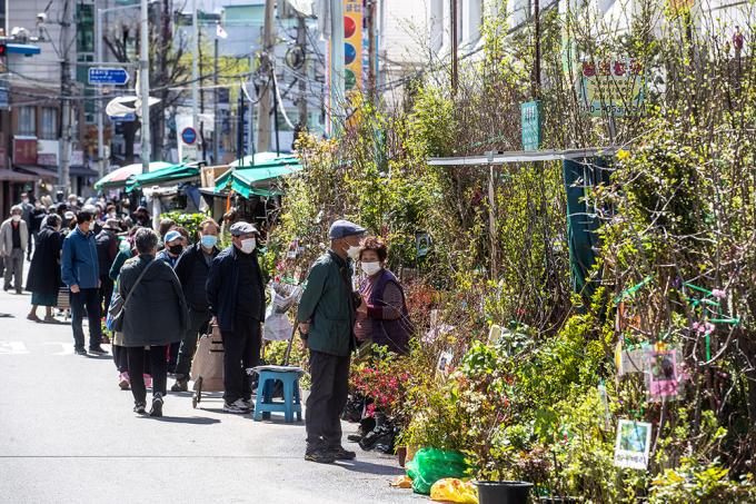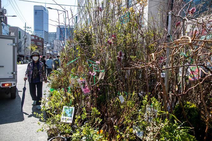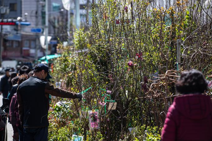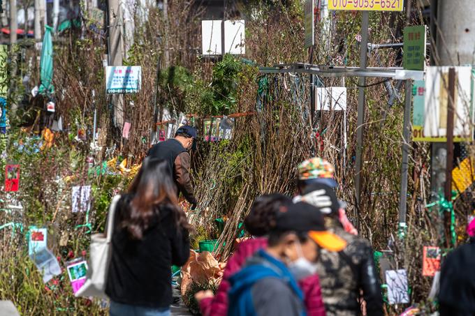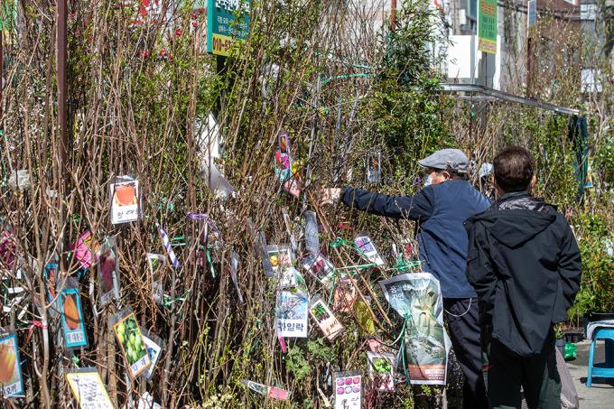 식목일인 5일 서울 종로꽃시장. 시민들이 묘목을 살펴보고 있다.