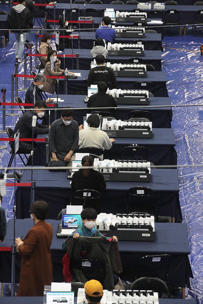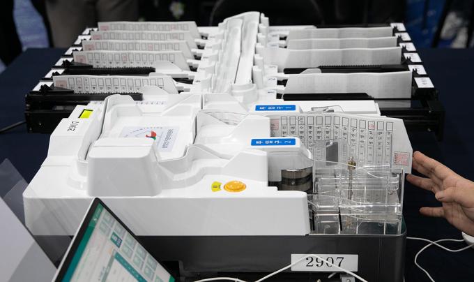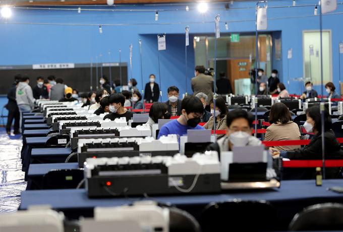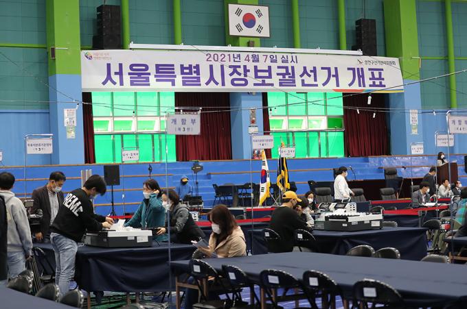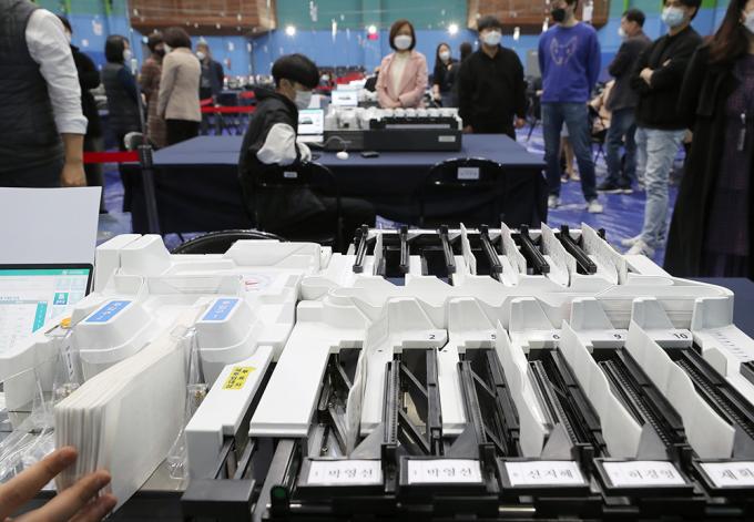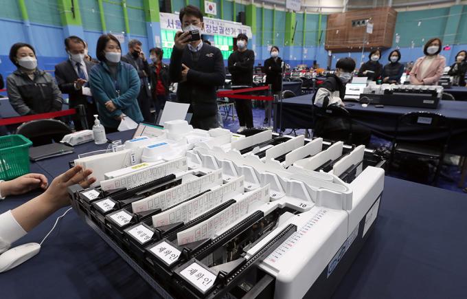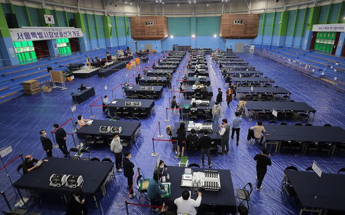 서울시장 보궐선거를 하루 앞둔 6일 오후 개표소가 마련된 서울 양천구 계남다목적체육관에서 선관위 관계자와 개표사무원들이 투표지분류기 최종 모의시험을 하고 있다.