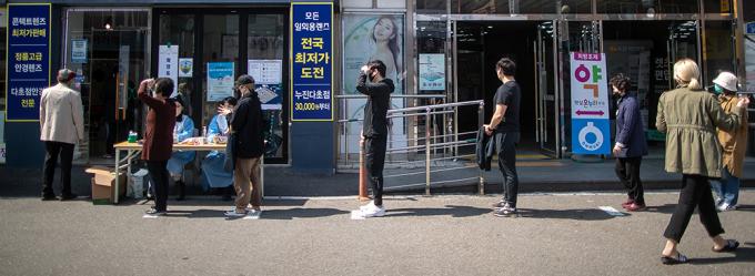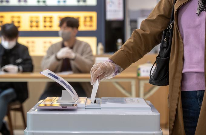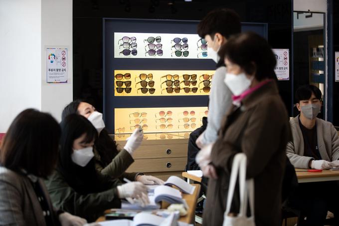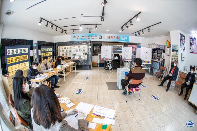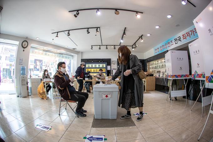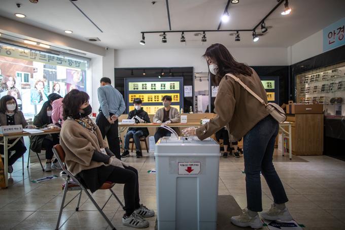 4.7 재보궐선거 투표일인 7일 서울 광진구 한 안경점에 설치된 투표소에서 유권자들이 투표하고 있다.