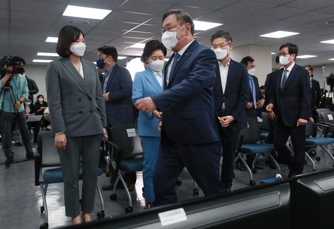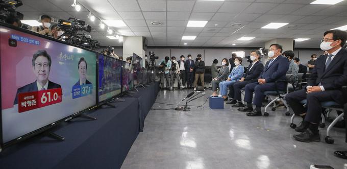 김태년 더불어민주당 대표 직무대행을 비롯한 참석자들이 7일 서울 여의도 당사에 마련된 개표상황실에서 출구조사 발표를 시청하고 있다