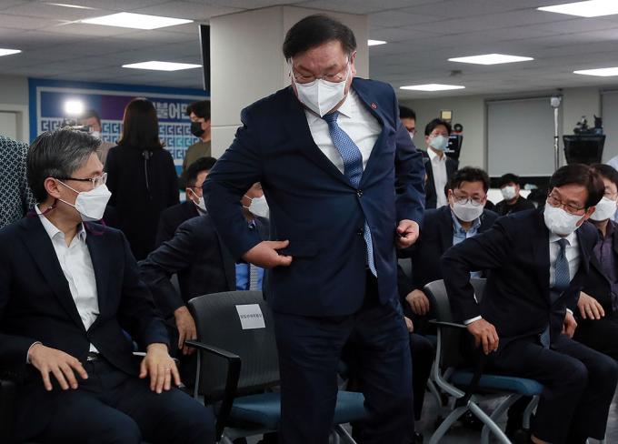 김태년 더불어민주당 대표 직무대행이 7일 오후 출구조사 결과를 확인하고는 굳은 표정으로 자리에서 일어나고 있다.
