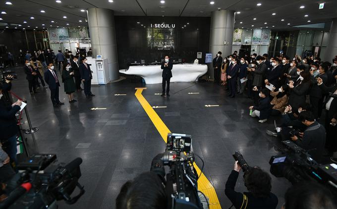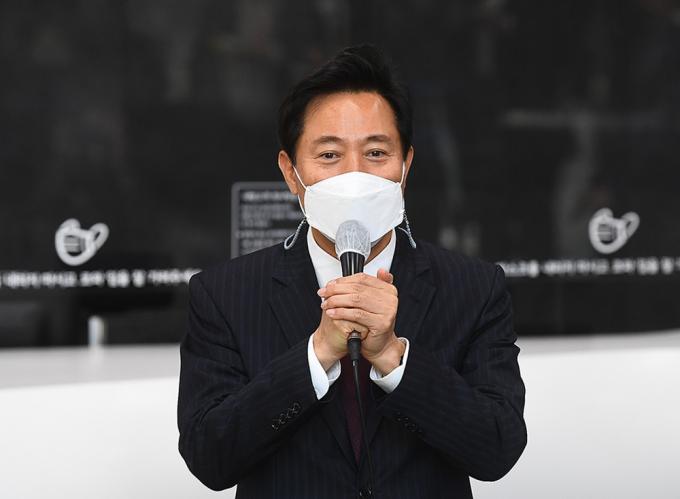 제38대 서울특별시장에 당선된 오세훈 시장이 8일 오전 서울시청으로 출근하고 있다.