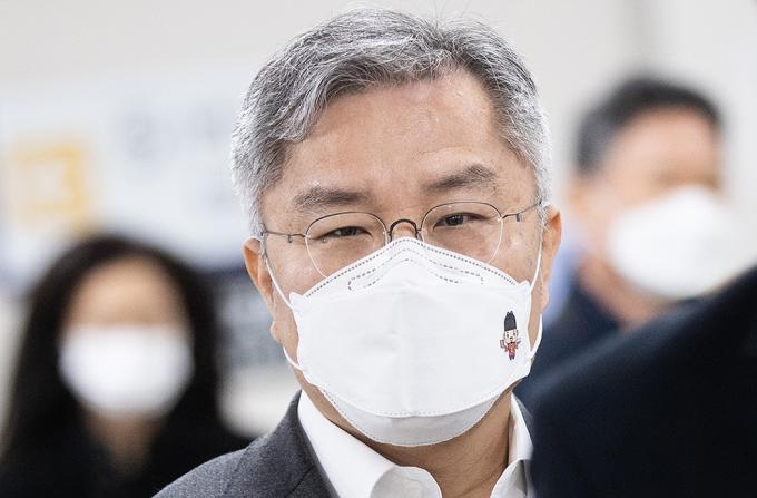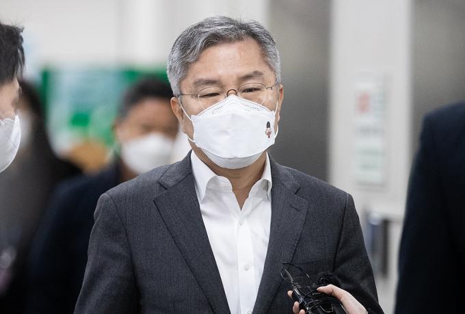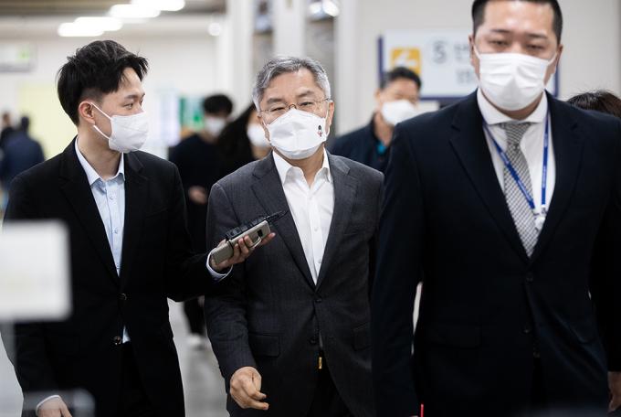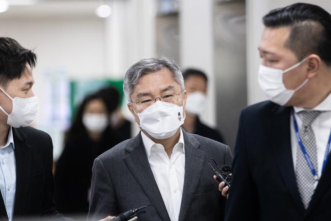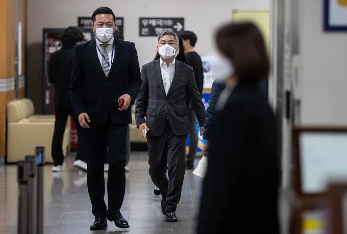 '검·언 유착 의혹'사건 연루 채널A 기자와 관련해 SNS에 허위사실을 유포한 혐의로 기소된 최강욱 열린민주당 대표가 9일 오전 서울중앙지방법원 1차 공판에 출석하고 있다.
