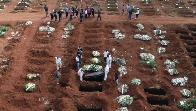 7일(현지시각) 브라질 상파울루의 한 공동묘지에서 코로나19 희생자 매장 작업이 진행중이다. 상파울루시는 코로나19 사망자 급증에 따라 시립 묘지에 매일 600기 정도의 묘지를 추가하고 있다고 밝혔다. [상파울루=AP/뉴시스]