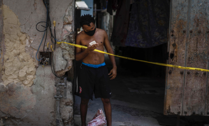 7일(현지시각) 쿠바 수도 아바나에서 마스크를 착용한 남성이 코로나19로 격리된 집 현관에서 스마트폰을 보고 있다. [아바나=AP/뉴시스]