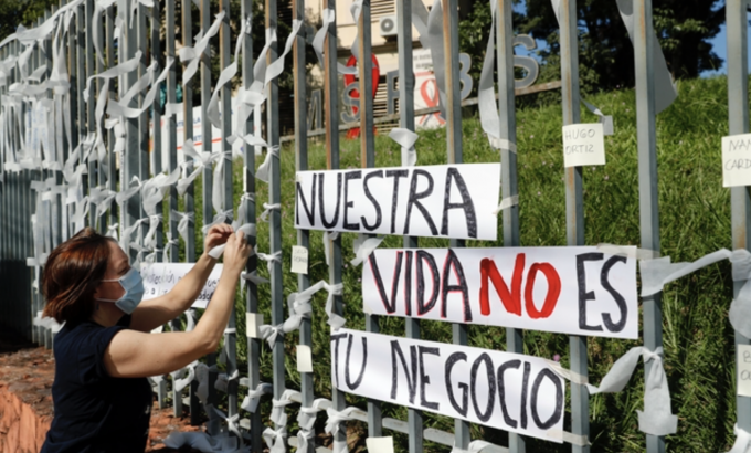 7일(현지시각) 파라과이 수도 아순시온에서 국제사면위원회, 암네스티의 한 회원이 코로나19 희생자 이름이 적힌 리본을 보건부 울타리에 묶고 있다. 파라과이의 코로나19 사망자는 4522명으로 집계됐다. [아순시온=AP/뉴시스]