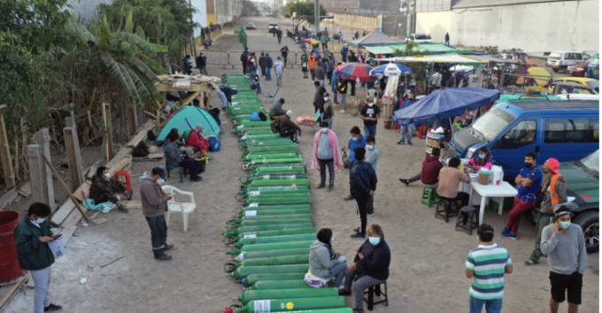 6일(현지시각) 페루 리마의 비야 엘살바도르에서 코로나19 환자를 치료할 의료용 산소를 구하려는 환자 가족들이 재충전용 산소 탱크를 바닥에 깔아놓고 충전소 영업 시작을 기다리고 있다. [리마=AP/뉴시스]