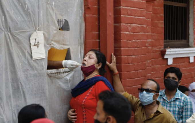 7일(현지시각) 인도 프라아그라즈의 코로나19 검사소에서 한 여성이 검사를 받고 있다. 인도 정부는 코로나19 확산을 막기 위해 뉴델리, 뭄바이를 비롯한 수십 개 도시에서 야간 통행 금지를 시행했다. [프라야그라즈=AP/뉴시스]