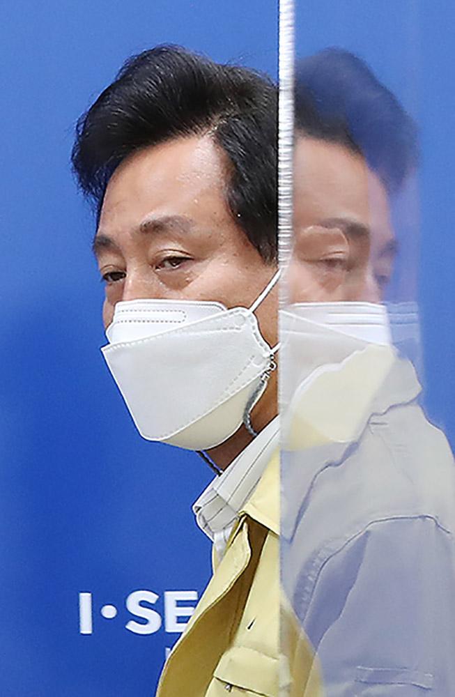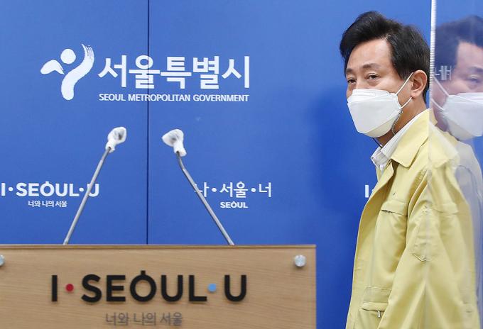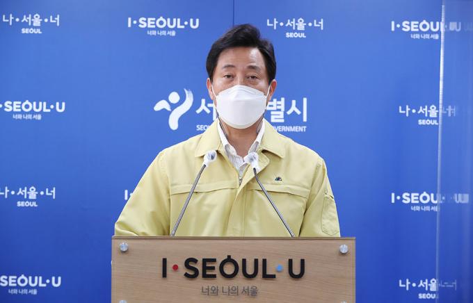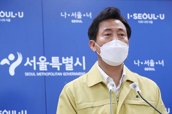 오세훈 서울시장이 12일 오전 서울시청에서 코로나19 브리핑을 하고 있다.