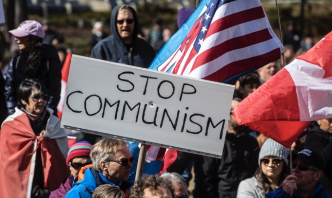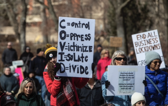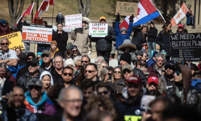 12일(현지 시간) 캐나다 앨버타주 에드먼턴에 있는 앨버타주 의회 앞에서 코로나19 봉쇄와 마스크 착용에 반대하는 사람들이 손팻말을 들고 시위하고 있다. 코로나19 봉쇄가 공산주의일까. "공산주의를 멈추라"는 팻말이 의아하다. [AP 뉴시스]