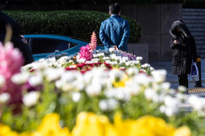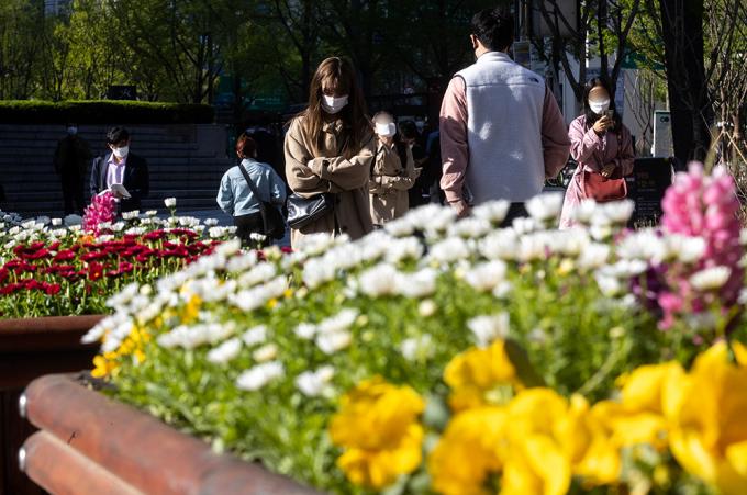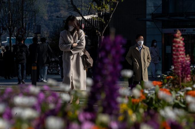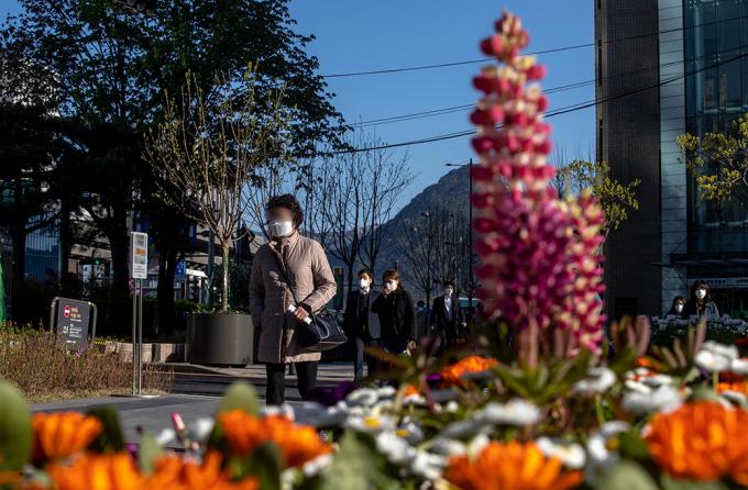꽃샘추위가 찾아온 14일 아침 서울 청계광장 인근에서 출근길 시민들이 몸을 웅크린 채 발걸음을 옮기고 있다.