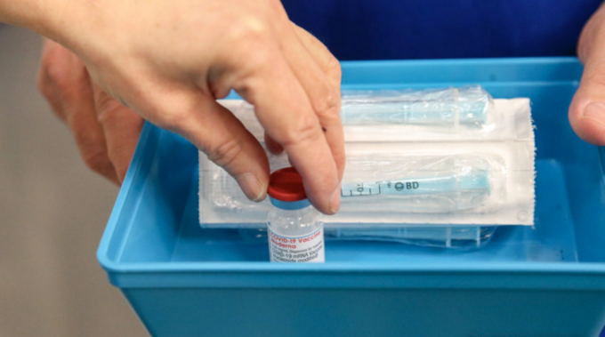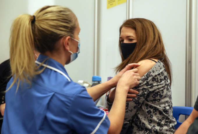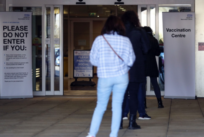 13일(현지시간) 영국 중남부 레딩의 마데스키 경기장에서 한 여성이 모더나 백신을 접종하고 있다. 이날부터 접종이 개시된 모더나는 영국에서 사용이 승인된 세 번째 백신이다. [AP 뉴시스]
