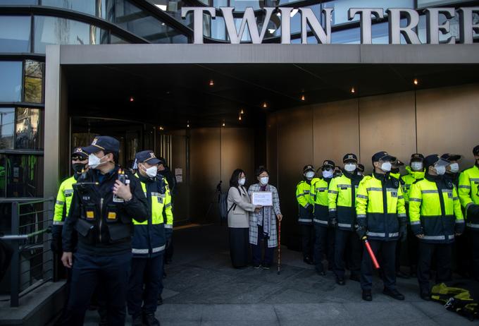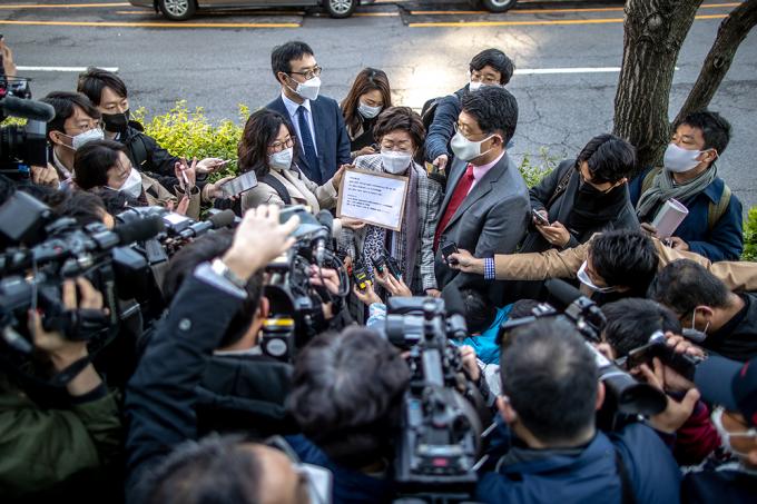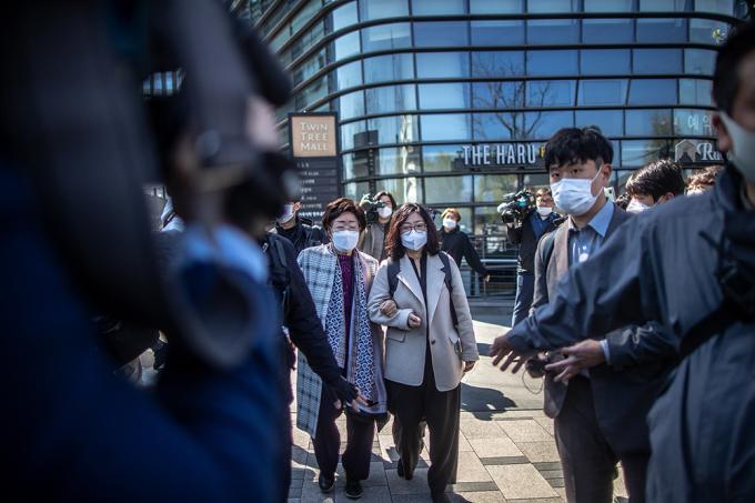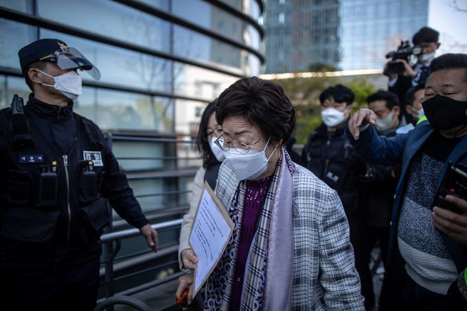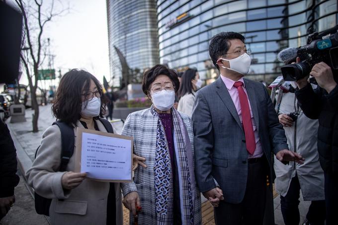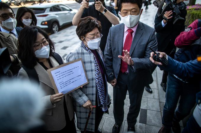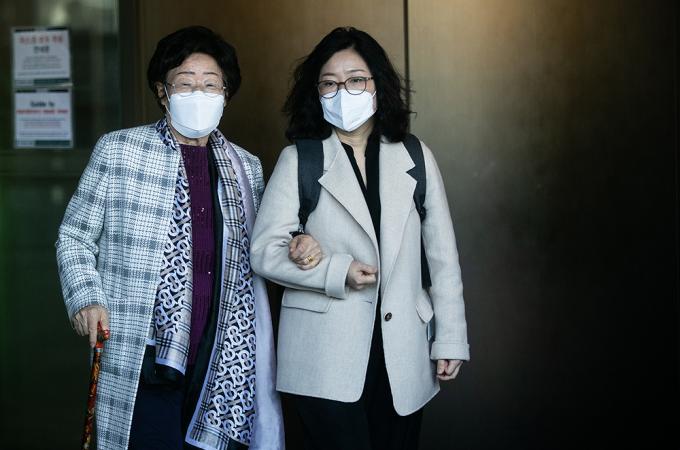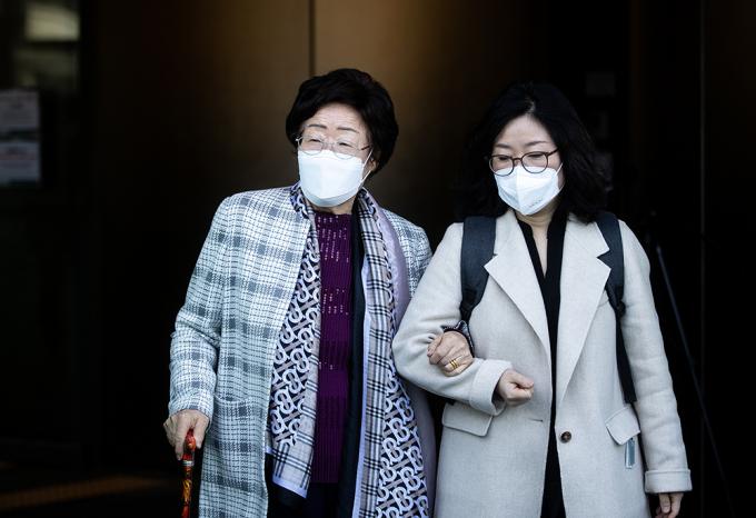 이용수 할머니가 14일 오전 일본대사관에 일본군 '위안부' 문제의 국제사법재판소(ICJ) 회부를 촉구하는 서한을 전달한 뒤 나오고 있다.