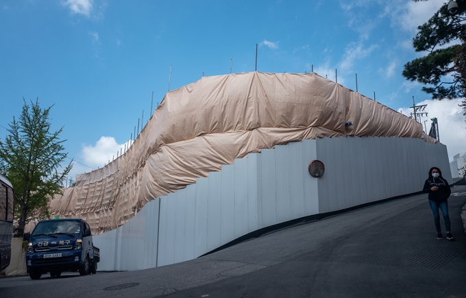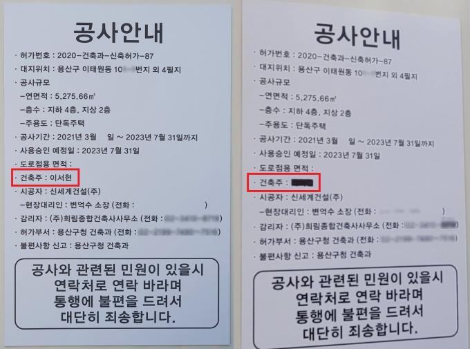 '남산캐슬' 한가운데 있는 서울 이태원동 10X-X번지. 한남동과 바로 맞닿아있는 이곳에 지난 3월부터 공사가 시작됐다. 공사장 철제 펜스 높이만 약 6m, 그 위에 설치된 가림막까지 합치면 무려 15m 높이의 장막이 공사 현장을 가리고 있다. 바깥에선 공사 현장 내부를 전혀 볼 수 없다. 철통 보안은 공사안내판에서도 드러났다. 지난 6일 오후 2시경 안내판에 적혀 있던 건축주 이름이 2시간 뒤에는 검은 매직으로 덧칠돼 있었다.
