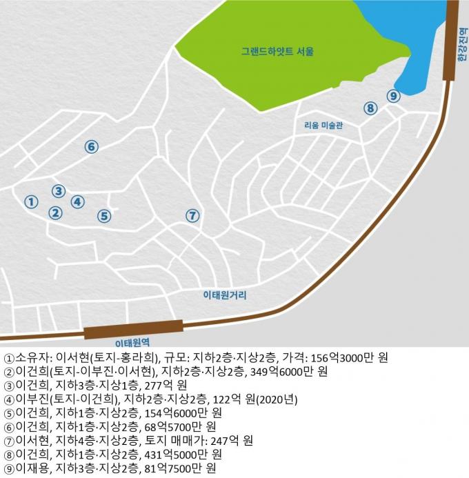 삼성가 3세 소유의 남산캐슬 주택은 조만간 더 늘어날 전망이다. 지난해 10월 25일 타계한 이건희 회장 소유의 자택이 상속될 예정이기 때문이다. 이 회장의 상속세 신고기한인 오는 4월 말까지 삼성가는 상속 재산 분배를 마무리해야 한다. 이 회장은 남산캐슬에 주택을 5채나 보유하고 있다. 이 가운데 한남동 74X-XX(431억5000만 원, [그림] ⑧)과 이태원동 13X-XX(349억6000만 원, [그림] ②) 등은 올해 개별주택가격이 전국 1, 2위를 차지했다. 이 회장은 2005년 한남동 74X-XX에서 이태원동 13X-XX으로 이사 갔다. 이 회장은 이와 함께 이태원동 13X-XX(277억 원, [그림] ③)와 이태원동 10X-XX(154억6000만 원, [그림] ⑤), 이태원동 13X-XX(68억5700만 원, [그림] ⑥) 등도 보유하고 있다. 이 회장 소유 주택 5채는 개별주택가격으로 모두 1281억2700만 원에 달한다.