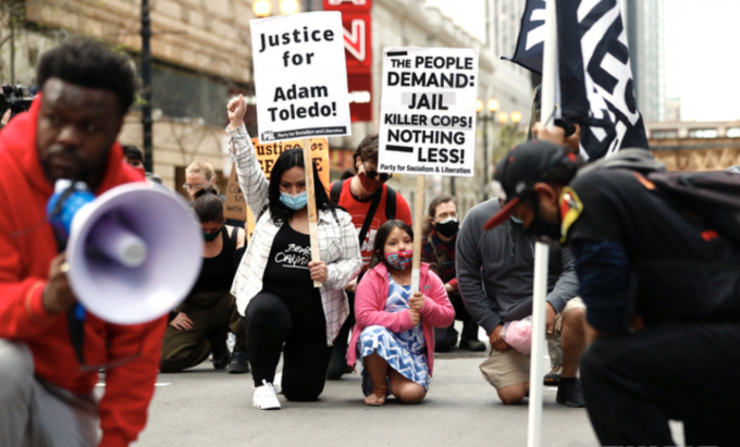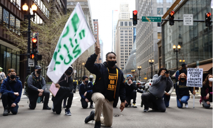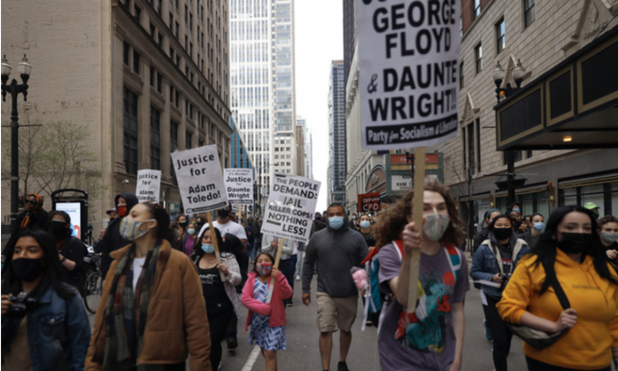 지난 11일(현지시간) 미네소타주 브루클린 센터에서 벌어진 경찰의 흑인 남성 단테 라이트(20) 총격 사망 사건 관련 항의 시위가 13일 미 일리노이주 시카고 도심에서 열리고 있다. [AP 뉴시스]