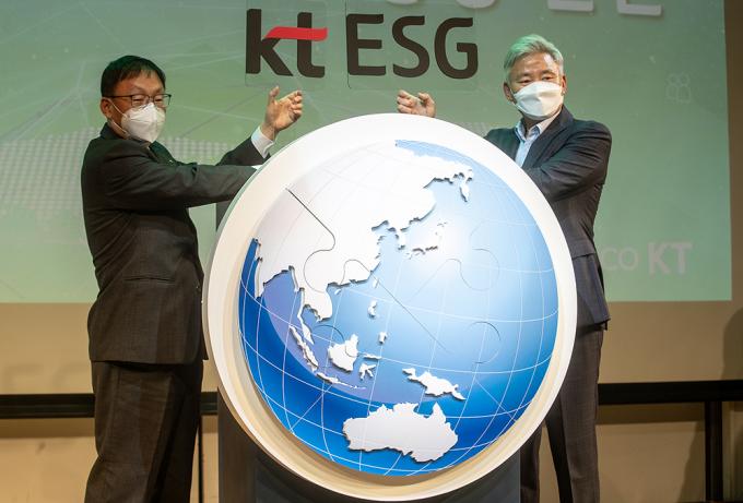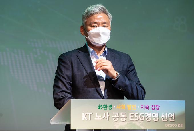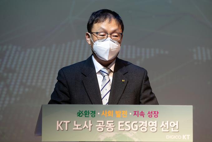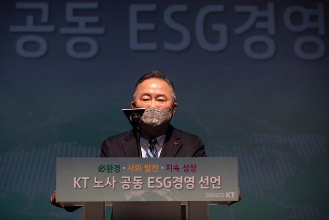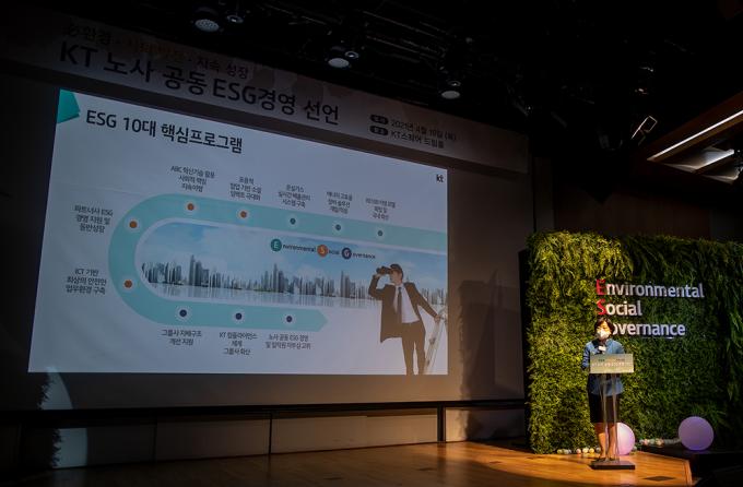 15일 오전 서울 종로구 KT스퀘어에서 열린 KT 노사공동 ESG 경영선언식에서 ESG 10대 핵심프로그램을 공개하고 있다.