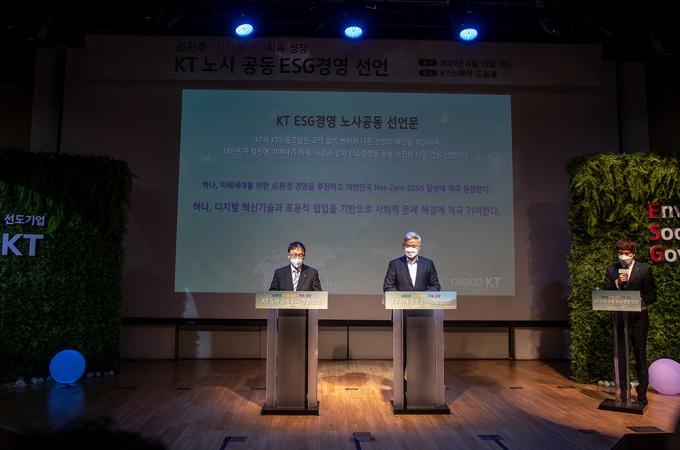 구현모(왼쪽) KT 대표와 최장복 KT 노동조합위원장이 15일 오전 서울 종로구 KT스퀘어에서 열린 KT 노사공동 ESG 경영선언식에서 함께 포즈를 취하고 있다.