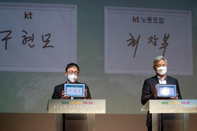 구현모 KT 대표와 최장복 KT 노동조합위원장이 15일 오전 서울 종로구 KT스퀘어에서 열린 KT 노사공동 ESG 경영선언식에서 서명한 뒤 서명판 기기를 들어보이고 있다.