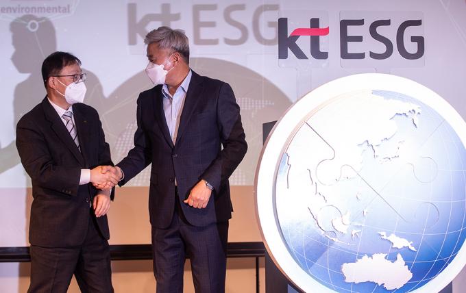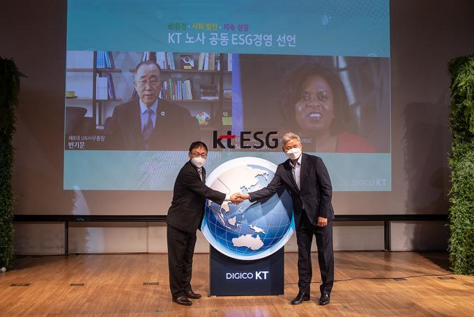 구현모 KT 대표와 최장복 KT 노동조합위원장이 15일 오전 서울 종로구 KT스퀘어에서 열린 KT 노사공동 ESG 경영선언식에서 서명을 마친 뒤 악수하고 있다.