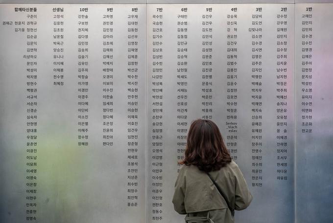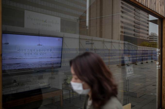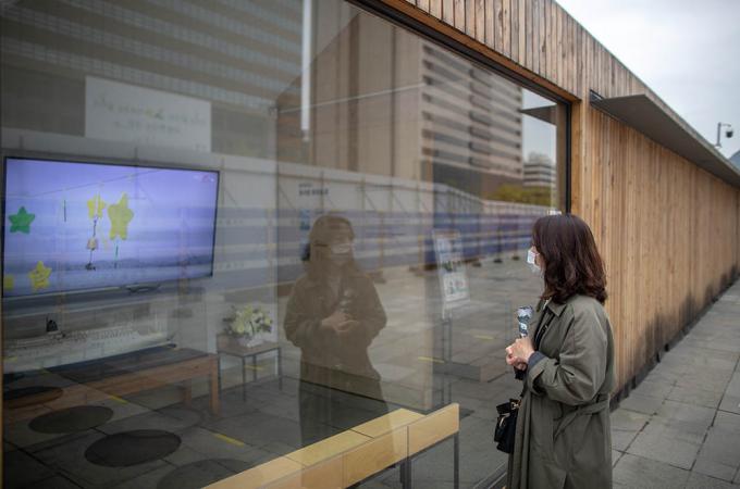세월호 참사 7주기인 16일 오전 서울 광화문광장 세월호 기억공간에서 한 시민이 참사 관련 영상을 보고 있다.