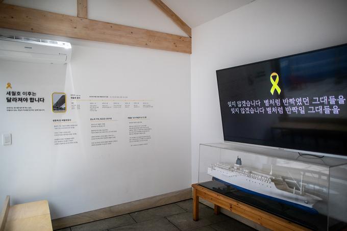 세월호 참사 7주기인 16일 오전 서울 광화문광장 세월호 기억공간에 관련 영상이 TV를 통해 나오고 있다.