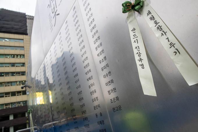 세월호 참사 7주기인 16일 오전 서울 광화문광장 세월호 기억공간. 희생자 추모와 진상 규명 의지를 담은 리본이 붙어 있다.