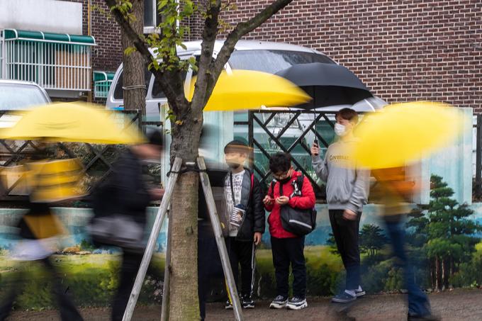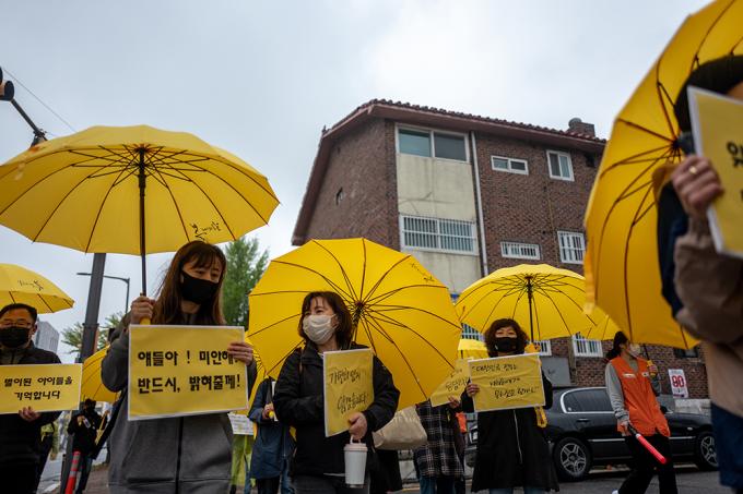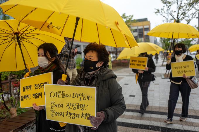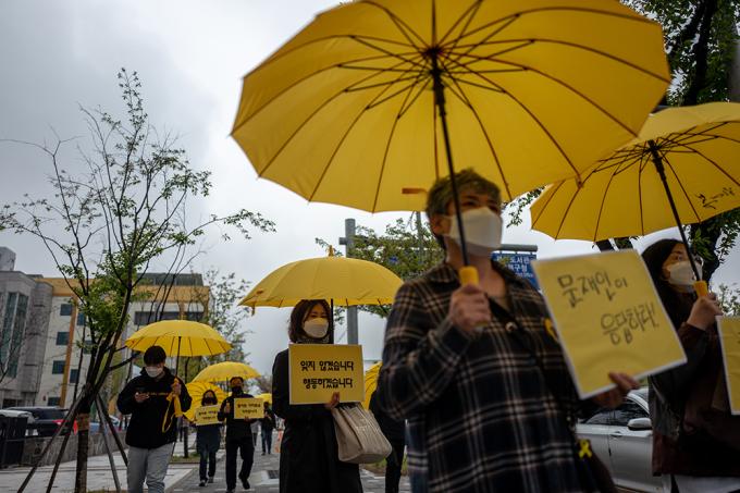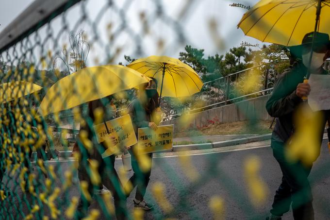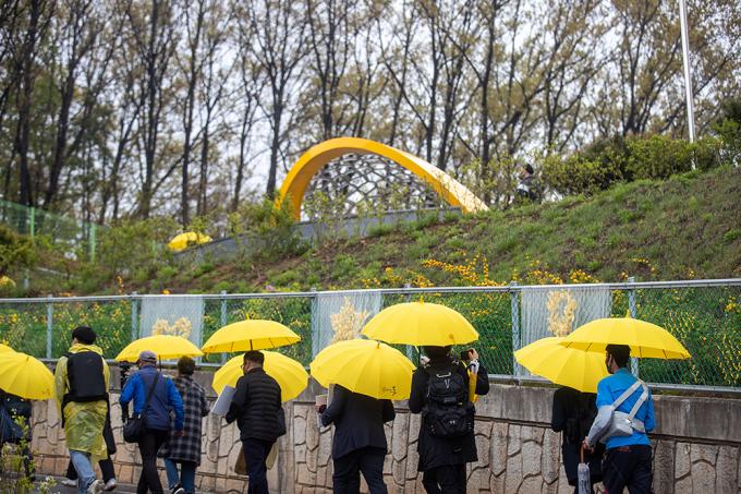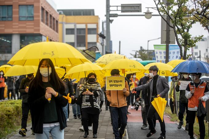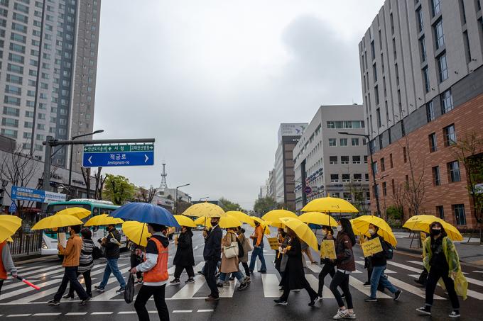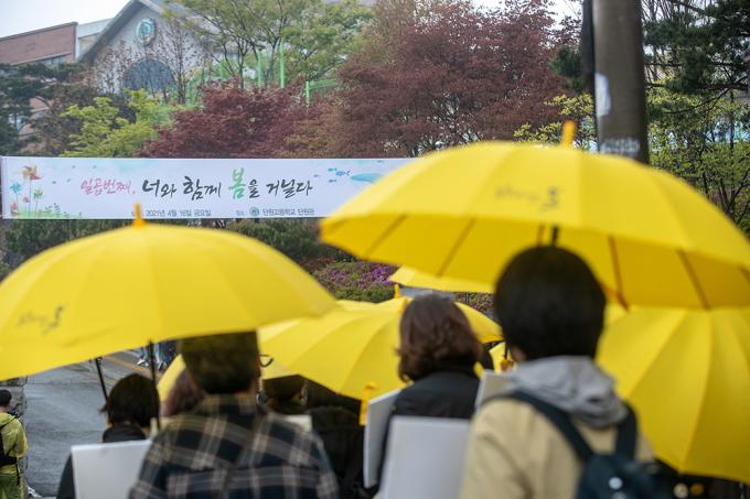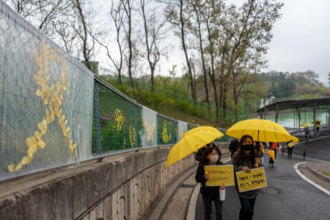 세월호 참사 7주기인 16일 경기 안산 단원구 4.16민주시민교육원 앞에서 '4월 16일 시민행진 너에게路'에 참가한 시민들이 노란우산을 쓴 채 단원고등학교로 행진하고 있다.