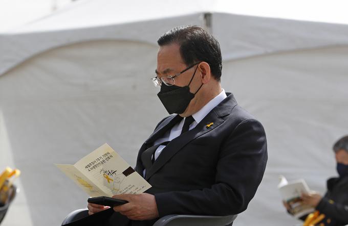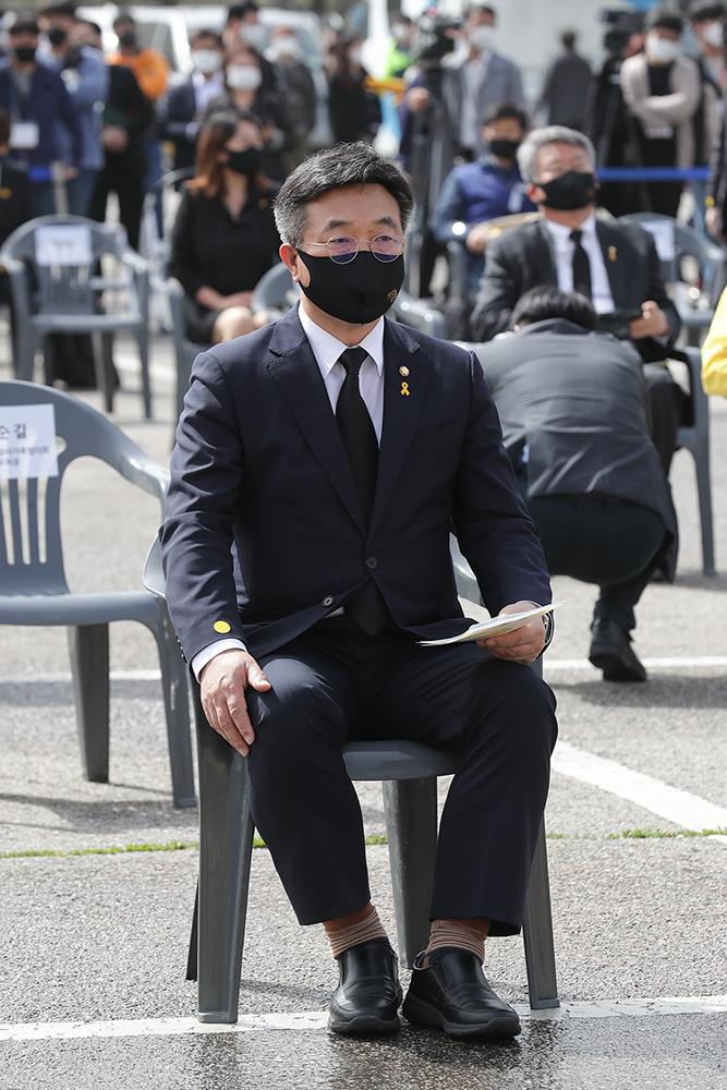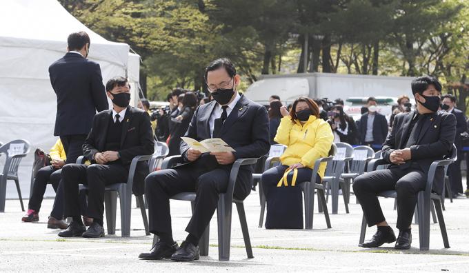 16일 오후 경기도 안산시 단원구 화랑유원지에서 열린 세월호 참사 7주기 기억식에서 더불어민주당 윤호중 신임 원내대표가 참석하고 있다.